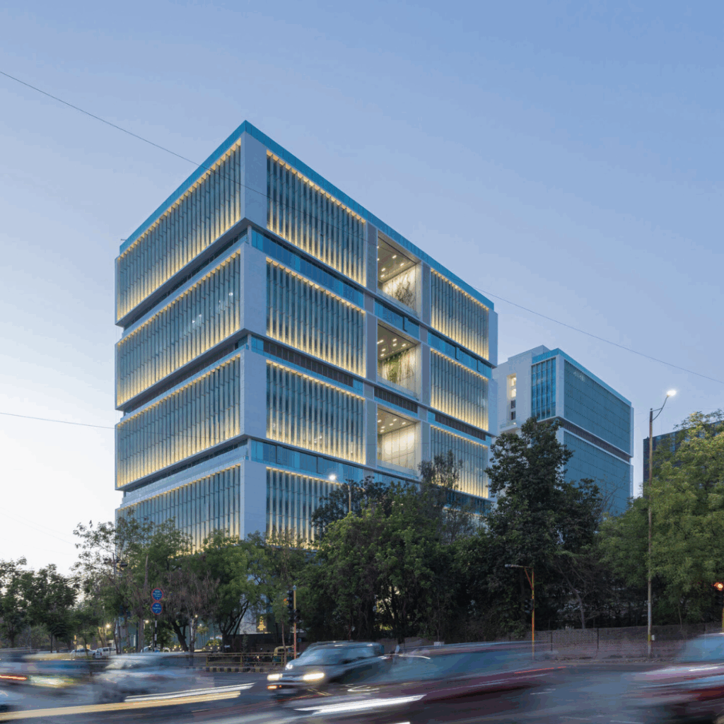 Situado na Zona de Desenvolvimento Orientado ao Trânsito de Ahmedabad, Índia, projeto do INI Design Studio, o edifício responde à dinâmica de mudança do trabalho contemporâneo com uma arquitetura enraizada na flexibilidade, sustentabilidade e identidade urbana.
