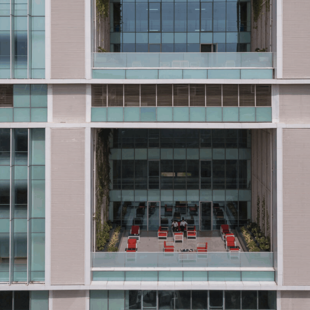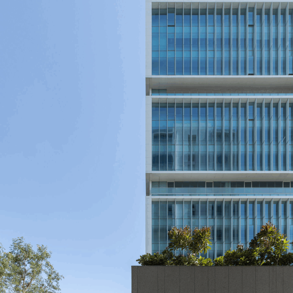 Sua forma composta por volumes empilhados envoltos em vidros de alto desempenho de pele dupla, hospeda espaços de trabalho premium enquanto integra breakouts biofílicos, infraestrutura avançada e sistemas ambientalmente responsáveis.