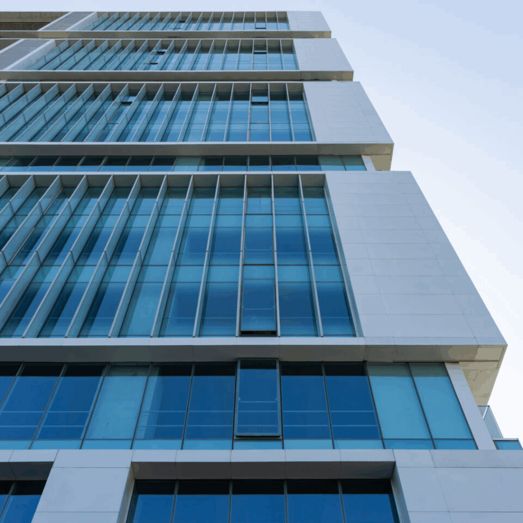 Aletas de vidro verticais e unidades de vidros duplos revestidos com fritas de cerâmica formam uma camada de sombreamento passiva, melhorando o desempenho térmico e dando à fachada uma textura rítmica.