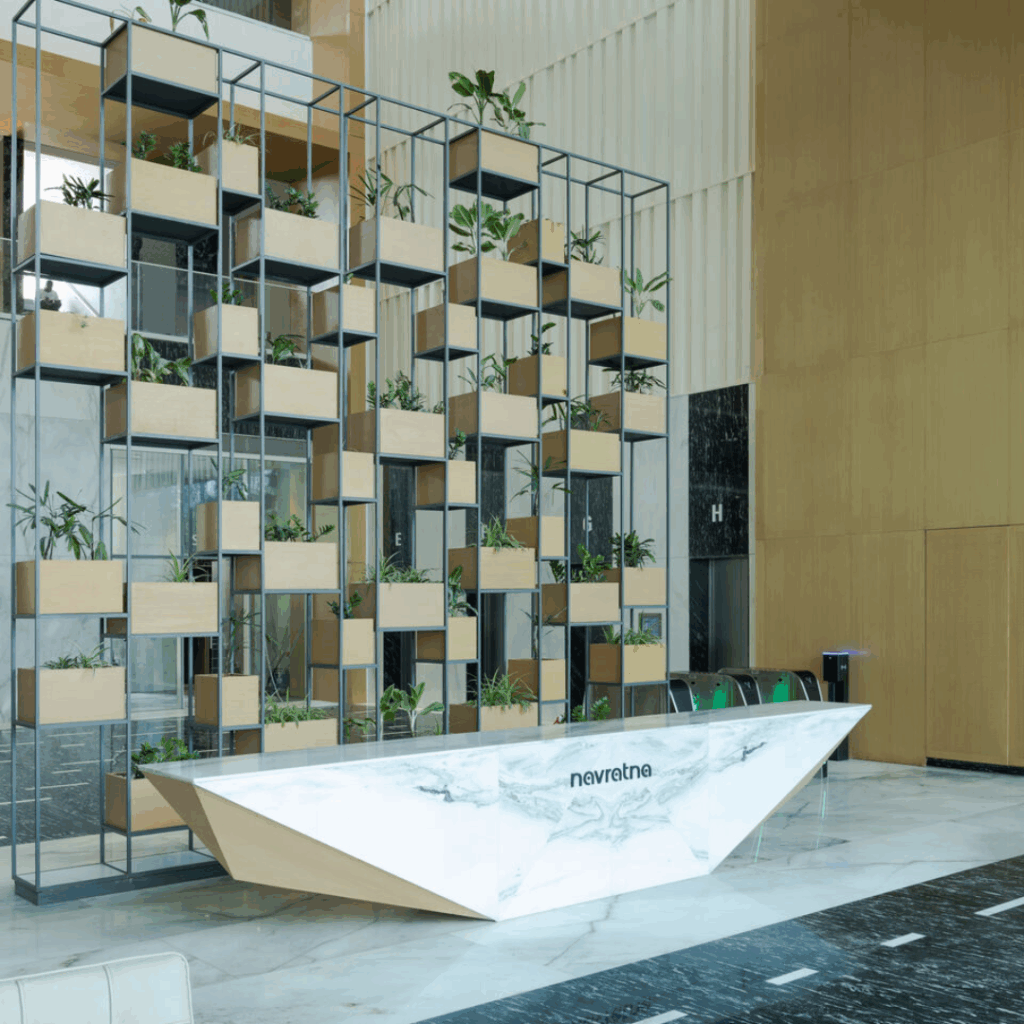 Entre as duas alas, paredes verdes verticais animam lobbies compartilhados, trazendo a natureza diretamente para zonas comuns elevadas e proporcionando momentos de alívio visual e espacial de áreas de trabalho densas.
