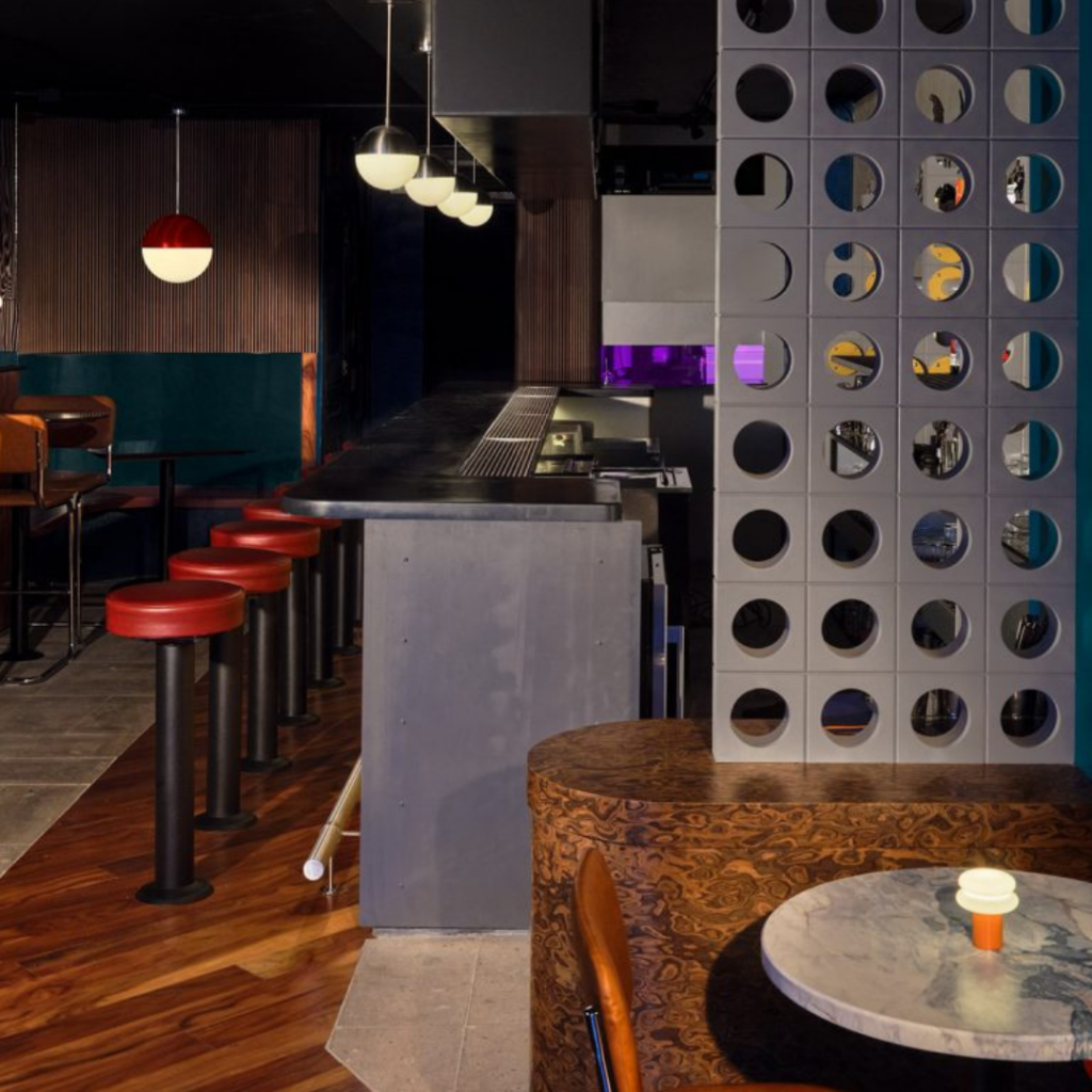 Para alcançar uma configuração eclética e retrô, o designer recorreu bastante a materiais, como a madeira de burl, aplicada em um elemento divisor que separa a área de assentos da frente do bar até as mesas.