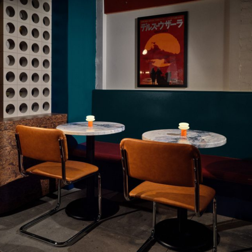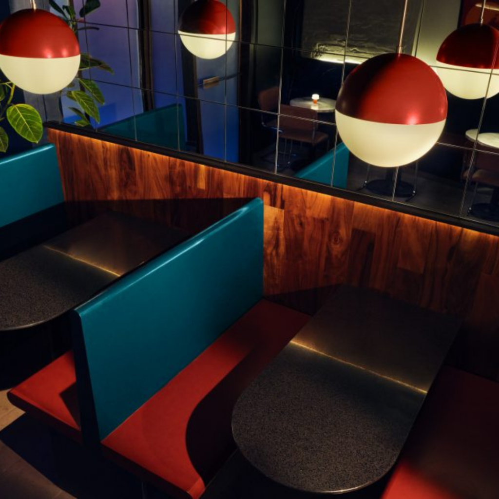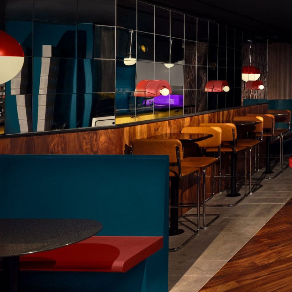 O tampo do bar e algumas mesas foram cobertos com Formica Solid Surfacing 501 ‘Black Lava’ para “ancorar” o espaço.