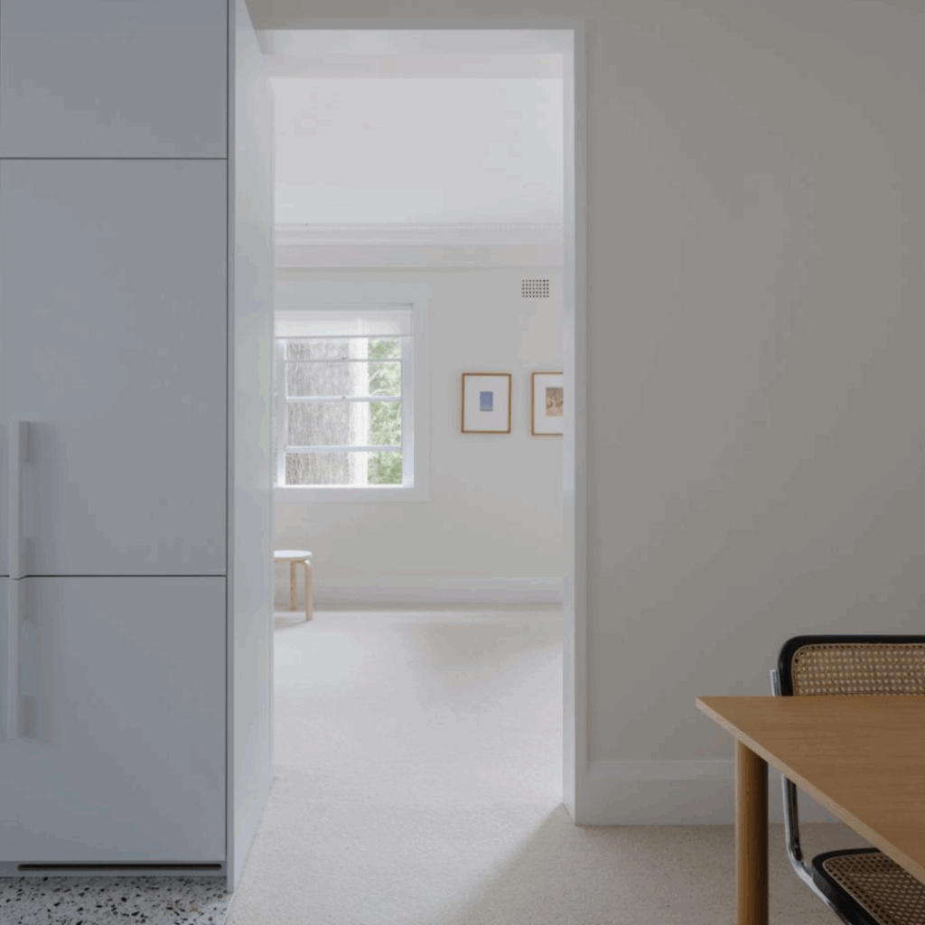 Paredes espessas funcionam como armários, permitindo que as características Art Déco originais do apartamento permaneçam visualmente contínuas e ininterruptas.