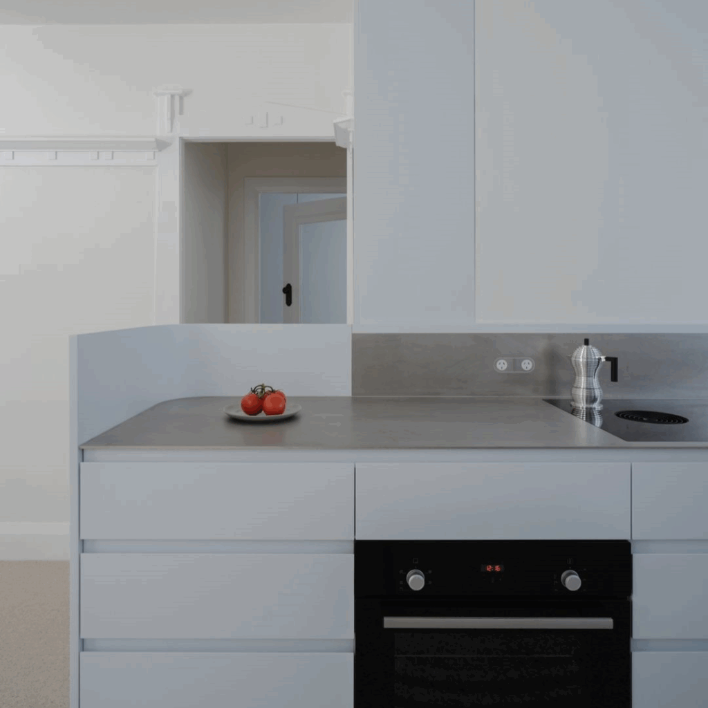 Na cozinha, armários em tons de cinza-azulado e terrazzo italiano salpicado criam uma sensação de continuidade material sem imitação.