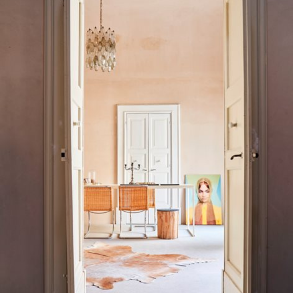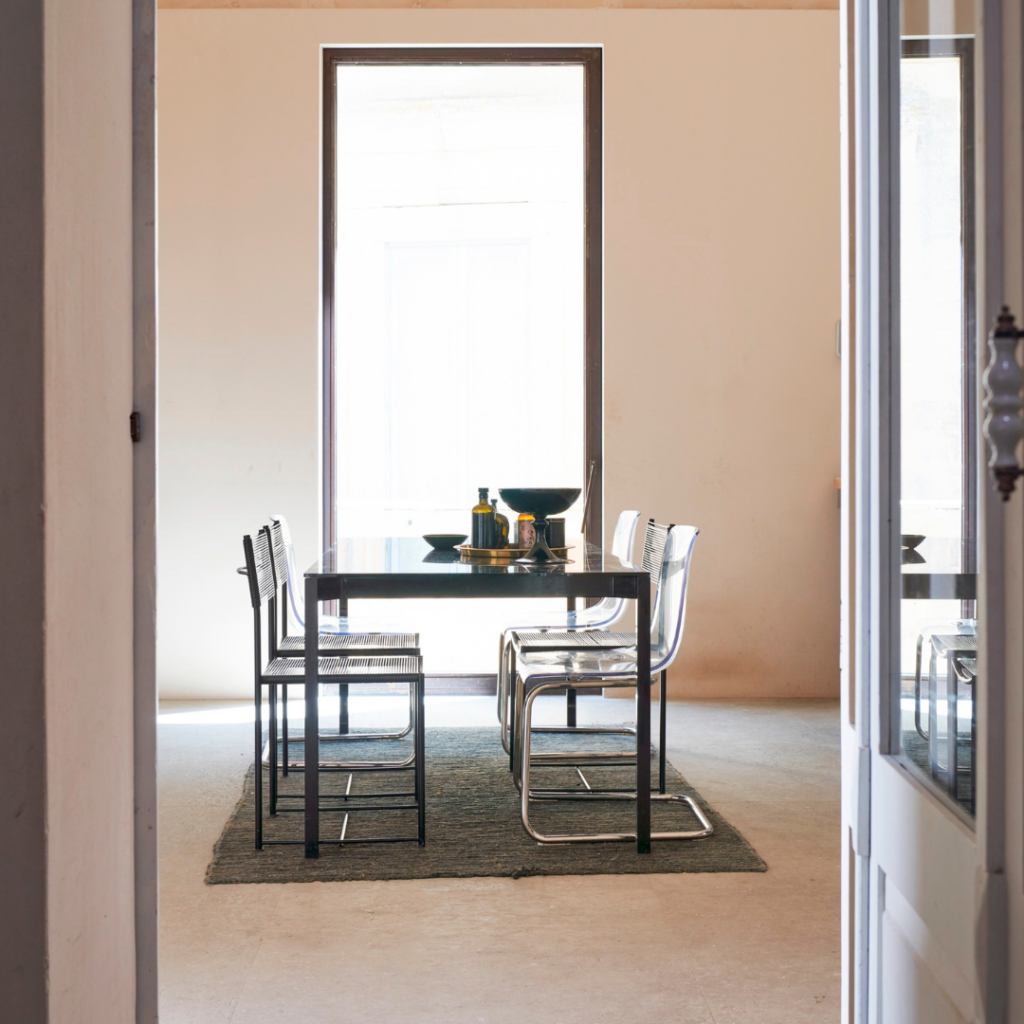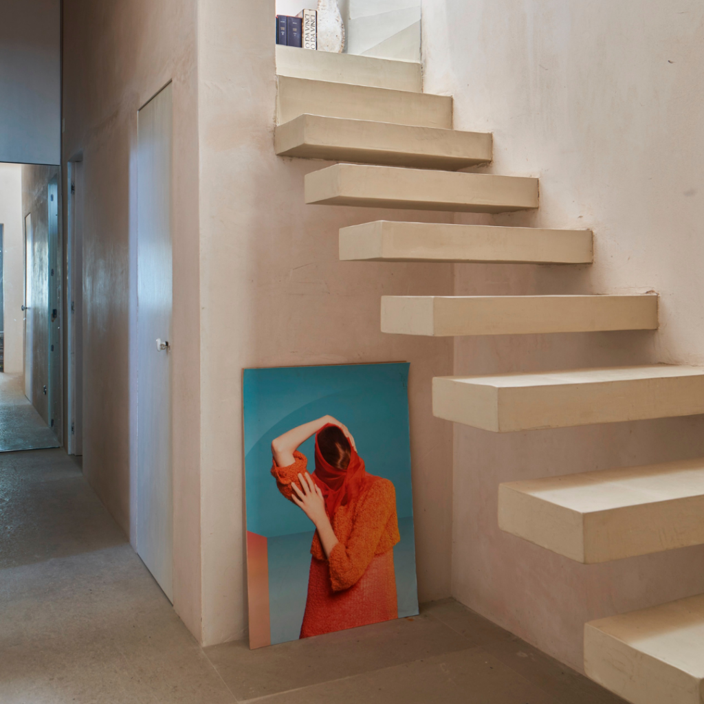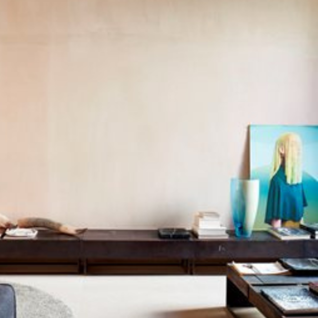Essa “caixa” neutra realça a luz zenital e serve de cenário para uma coleção curada de ícones de design como Carlo Scarpa, Mies van der Rohe, Vico Magistretti e móveis sob medida.