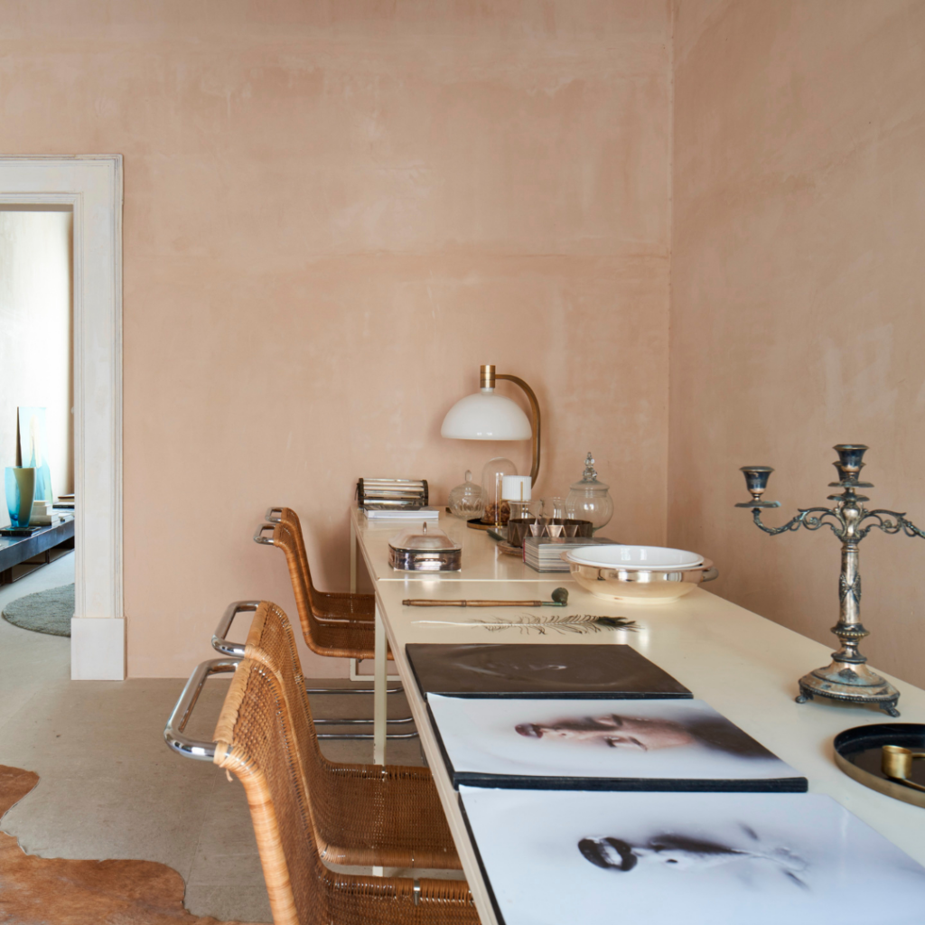 Piso de pedra Pietra Leccese de grande formato foi colocado para garantir continuidade dos materiais, dialogando com paredes tratadas exclusivamente com cal natural.