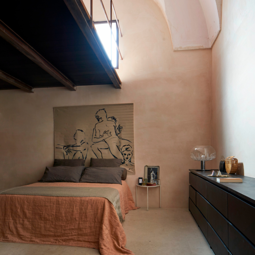 A antiga escadaria da torre agora leva a um estúdio no sótão que se abre para um terraço panorâmico de 360 graus, projetado como uma riad moderna com vista para o pátio interno.