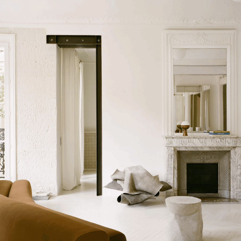 Os pisos em parquet envernizados a branco proporcionam um pano de fundo neutro que permite que esses contrastes de materiais sejam o centro das atenções.