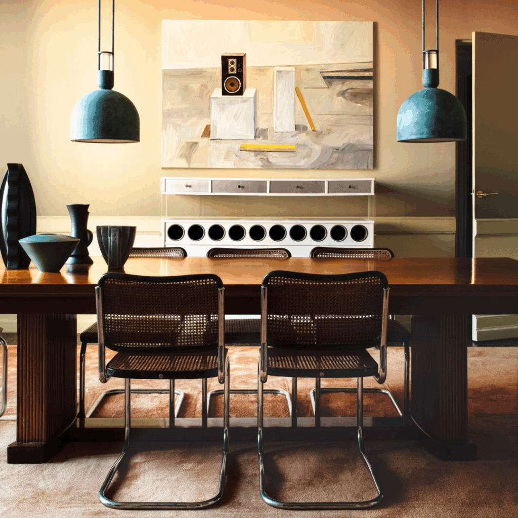 O mobiliário é uma mistura com curadoria de peças vintage e contemporâneas provenientes de galerias como Galerie Meubles et Lumières, Remix Gallery, Lemon Furniture e Morentz.