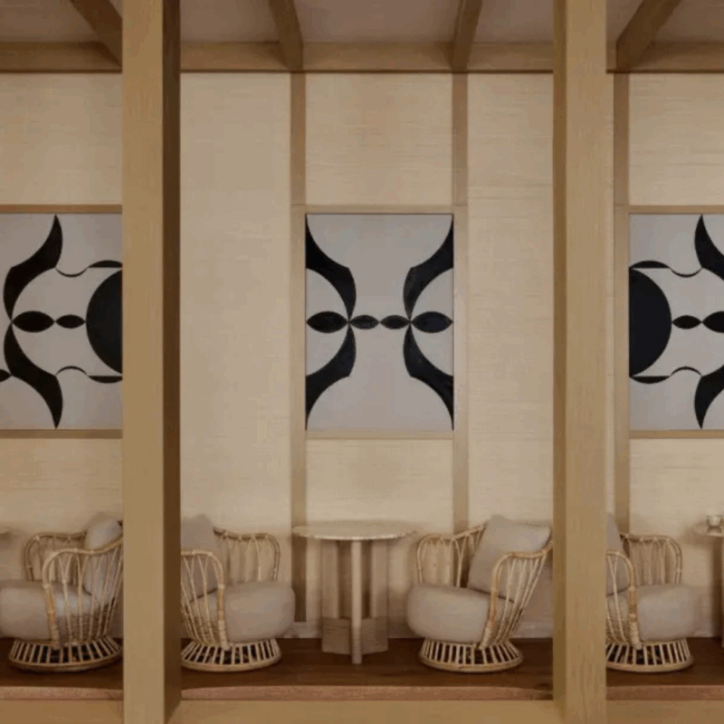 Os mesmos artistas contribuíram com um grande mural para o terraço, reforçando a conexão entre arte, design e cultura urbana.