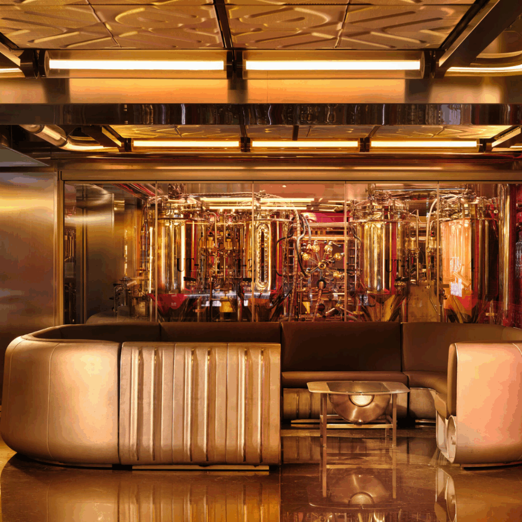 Móveis como bancos e vitrines são inspirados em tanques de cerveja industriais e feitos à mão a partir de barris recuperados, refletindo uma abordagem cradle-to-cradle alinhada com os princípios da economia circular.