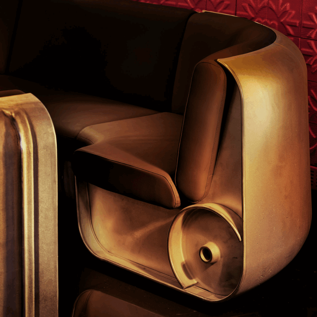 O lounge combina estética industrial com conforto, apresentando móveis feitos de alumínio fundido e aço inoxidável.