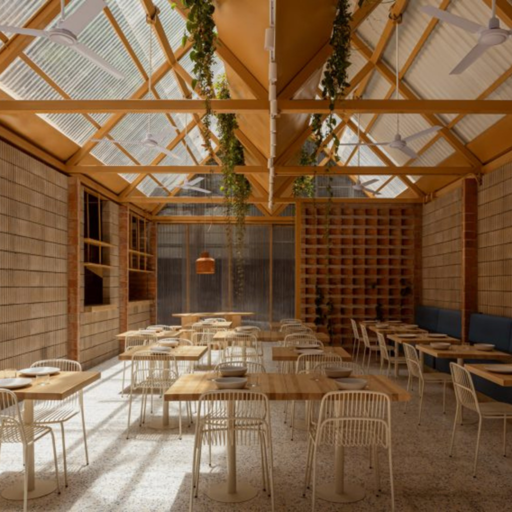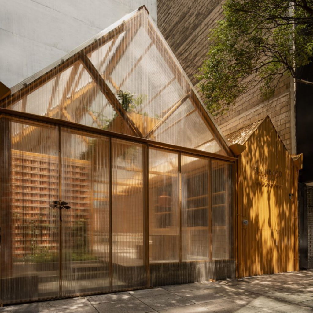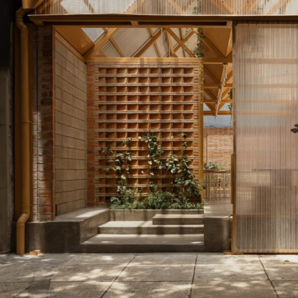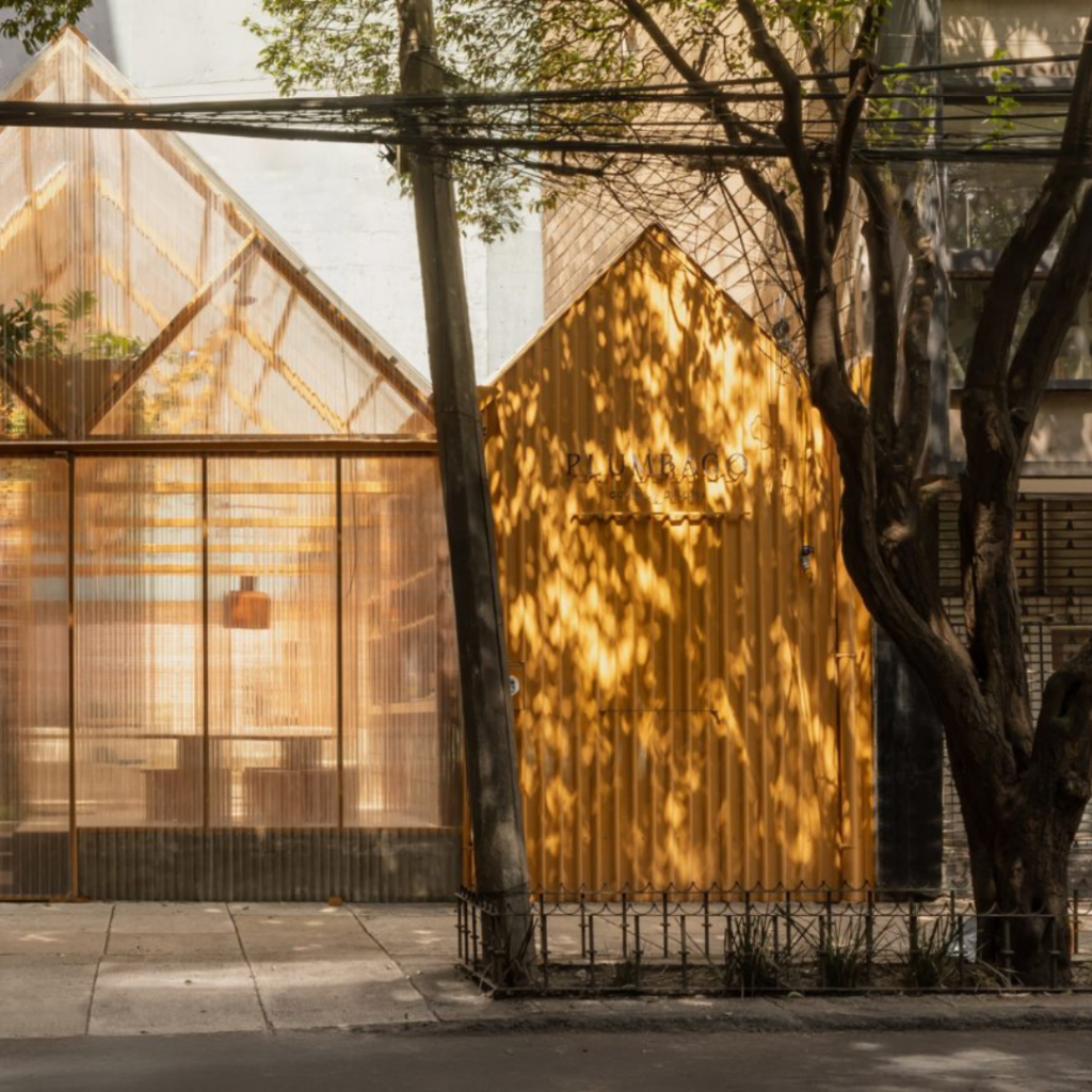 O estúdio OPA projetou o Plumbago, um restaurante em estilo galpão de jardim no bairro Cuauhtémoc, na Cidade do México, revestido com chapa de policarbonato.