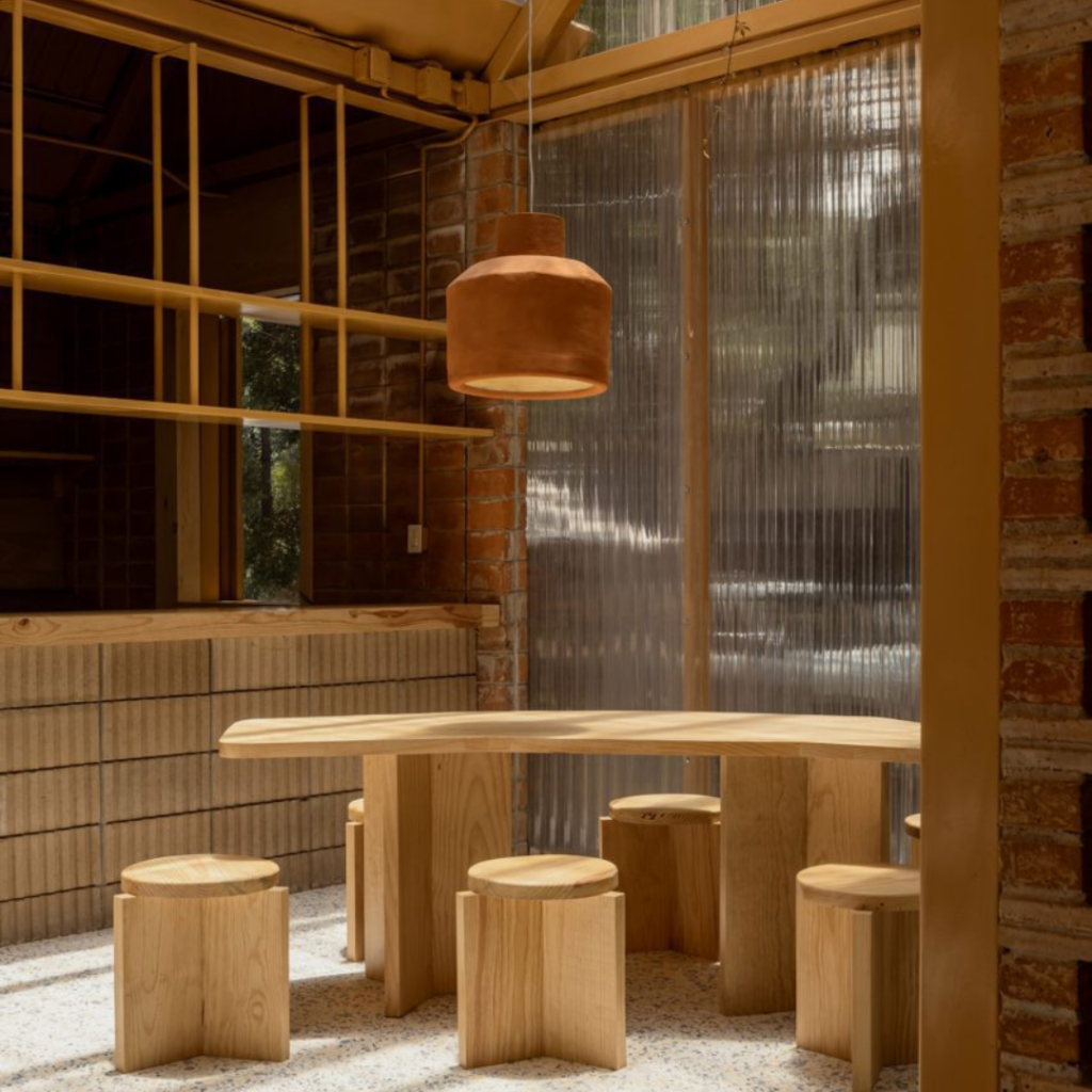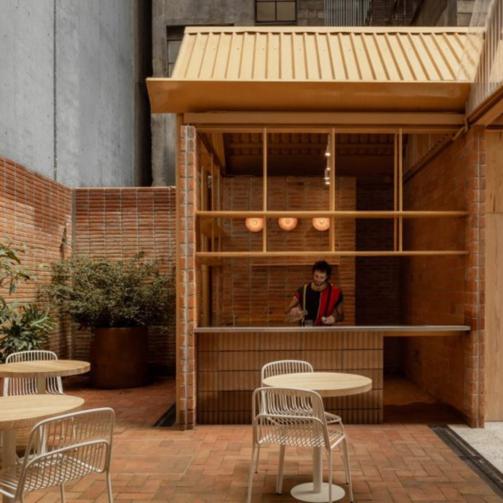 Os clientes entram no volume do restaurante por portas deslizantes de policarbonato, que se abrem para revelar pequenos degraus de concreto e uma parede decorativa de tijolos vermelhos perfurados.