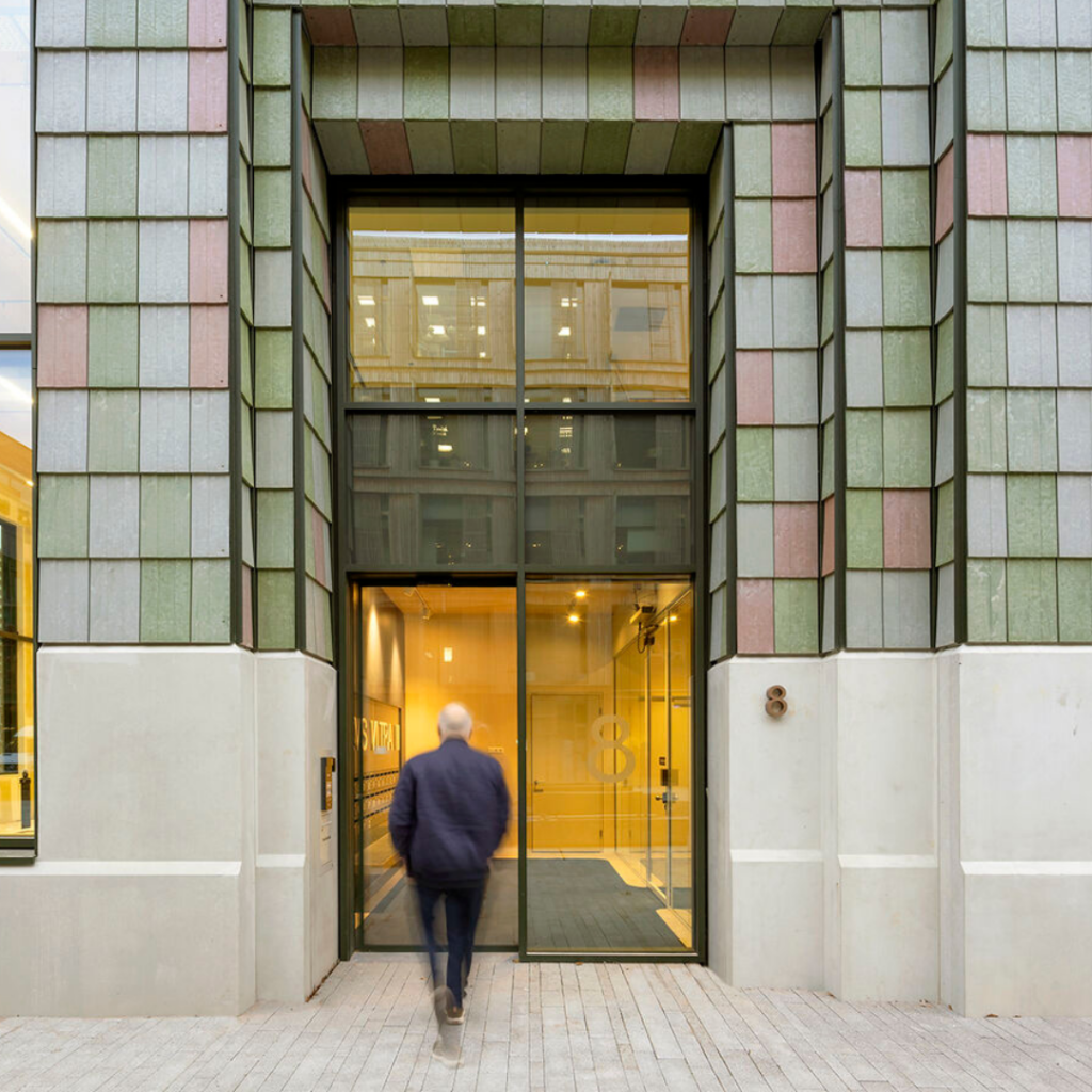 Desenvolvido com o atelier Loos van Vliet, o paisagismo inclui plantio em camadas, plantas perenes floridas e elementos destinados a apoiar a biodiversidade.