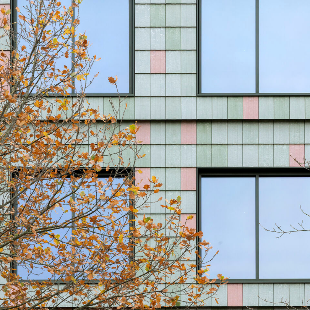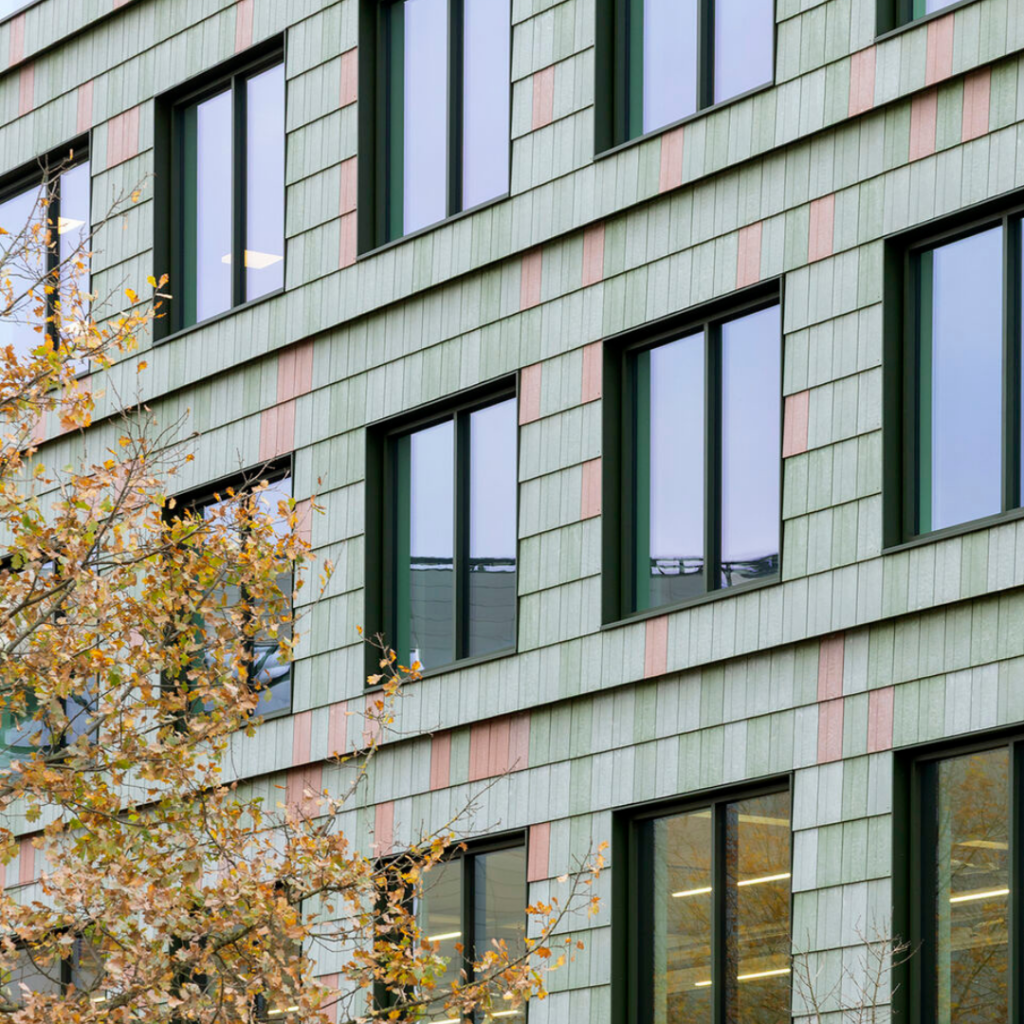 Variações sutis de cor se relacionam com a paisagem ao redor do campus, enquanto o relevo e a configuração sobreposta criam profundidade e sombra na fachada.