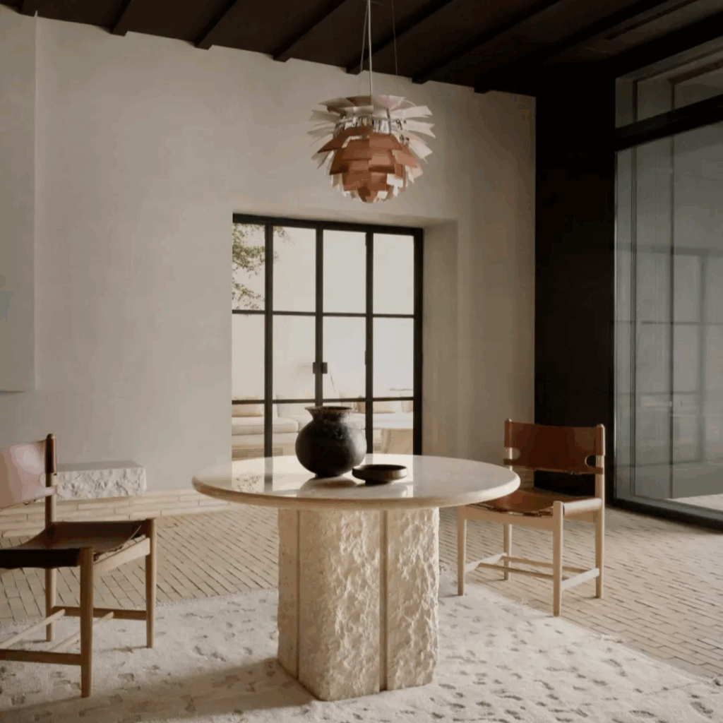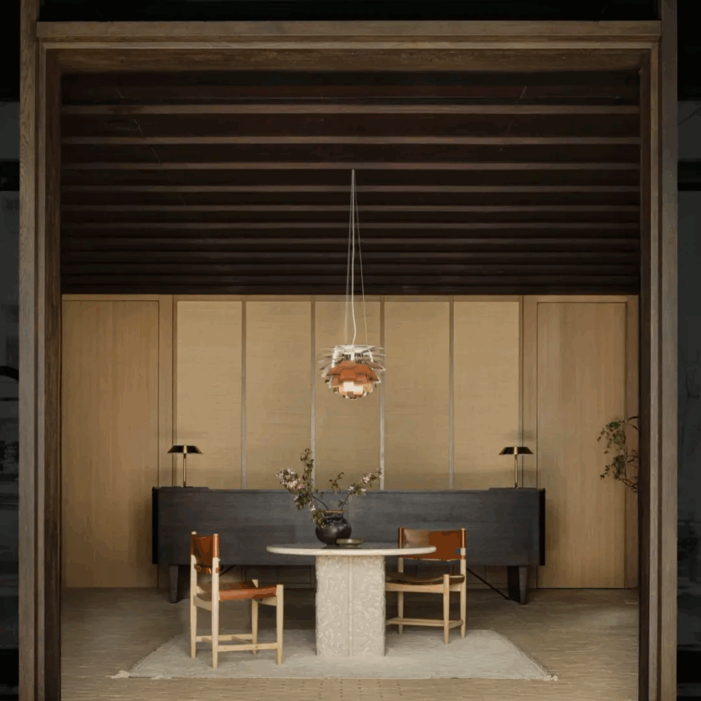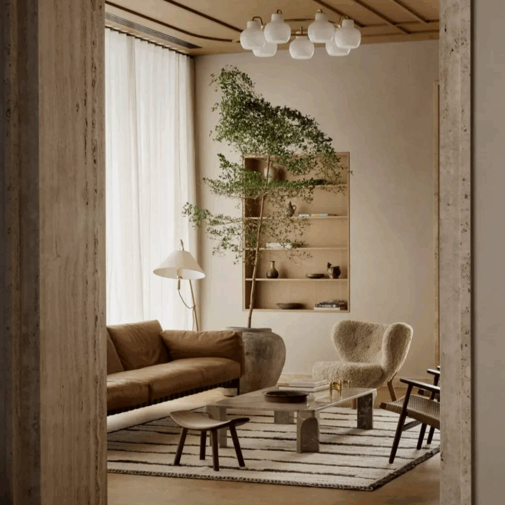Os móveis são feitos sob medida ou selecionados à mão de um panteão de mestres escandinavos, cada peça uma presença deliberada.