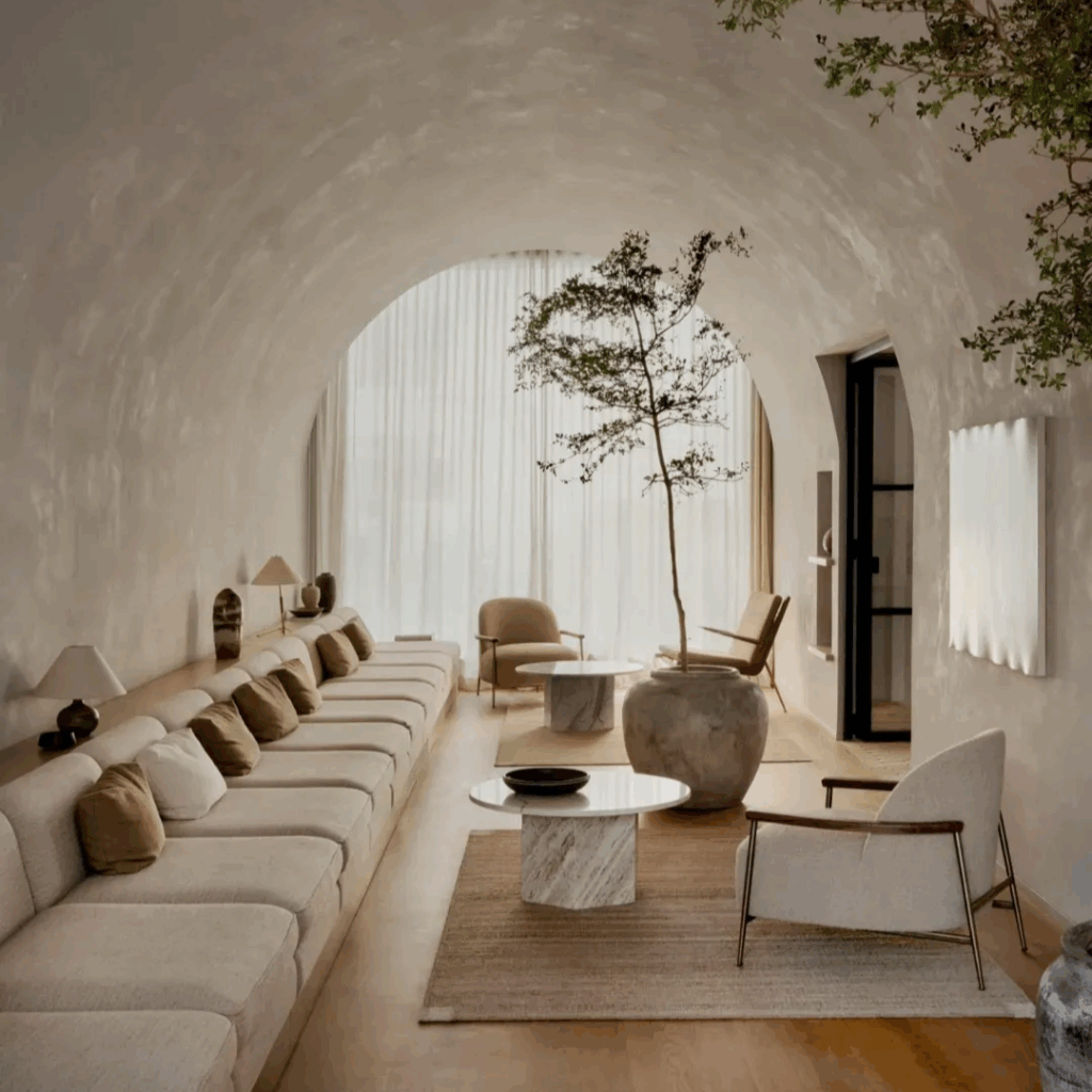 De limiares de travertino a longos corredores revestidos de madeira, o edifício é um estudo de continuidade e humildade material.