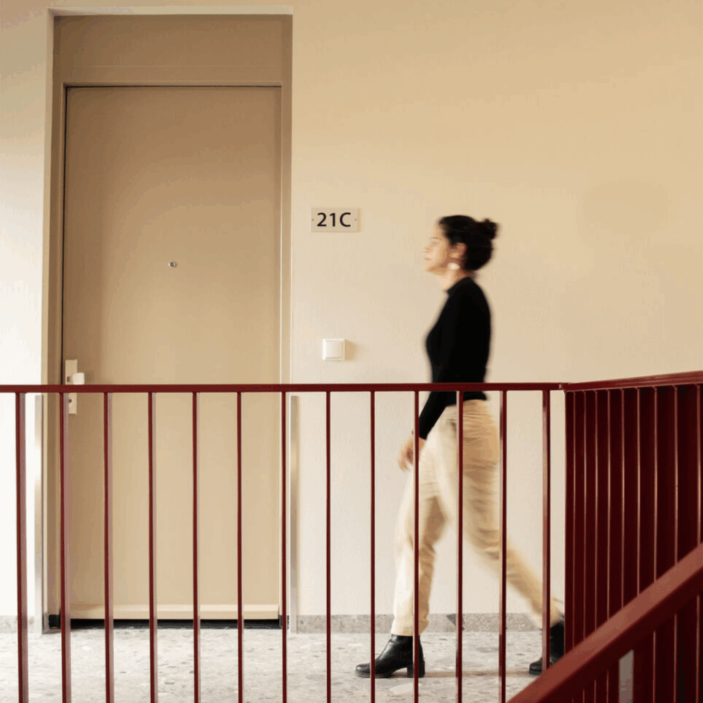 Ampliando o espaço público, cada residência recebe sua própria entrada ao nível da rua, completa com um pequeno espaço privado e um banco de concreto.