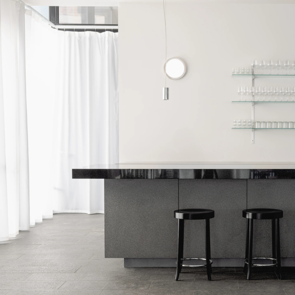 As texturas da pedra natural e do aço inoxidável são derivadas da paisagem urbana externa, cuidadosamente aplicadas em uma escala menor e mais tátil.