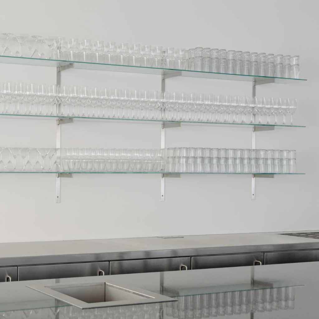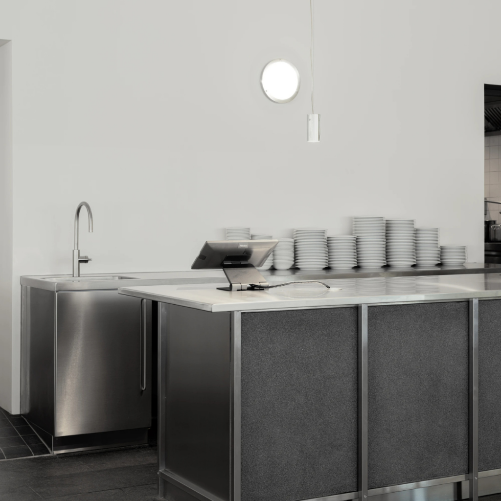 Uma família de móveis independentes em aço inoxidável preenche o espaço.