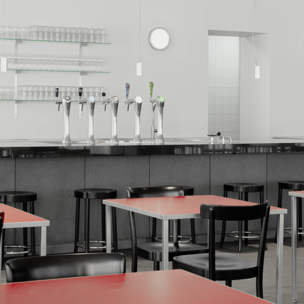Um bar longo e baixo percorre todo o comprimento do espaço, conectando o lado da rua ao salão central do museu.