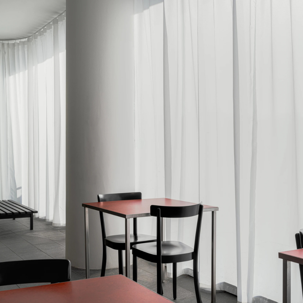 Ao longo da fachada envidraçada pende, uma cortina de altura total feita de tecido leve, alternando a atmosfera entre abertura e intimidade à medida que a luz e o horário do dia mudam.
