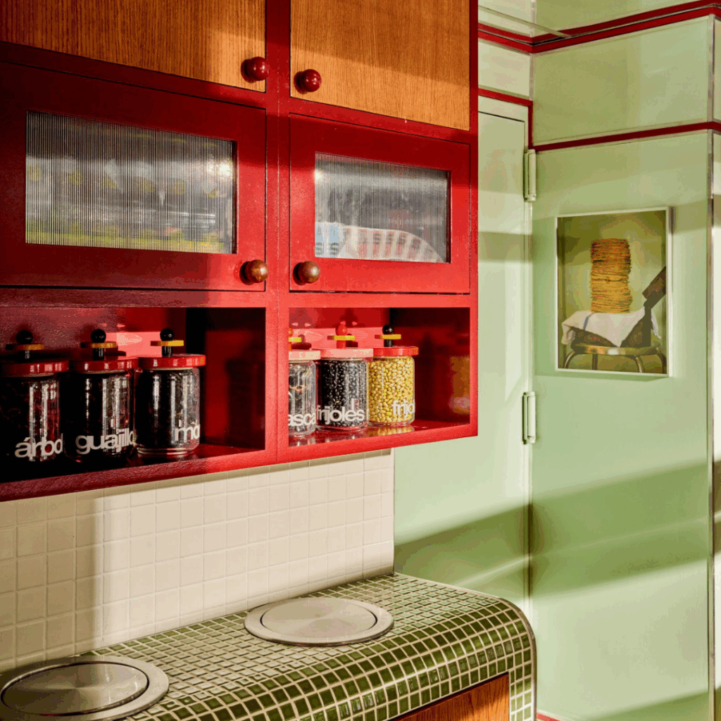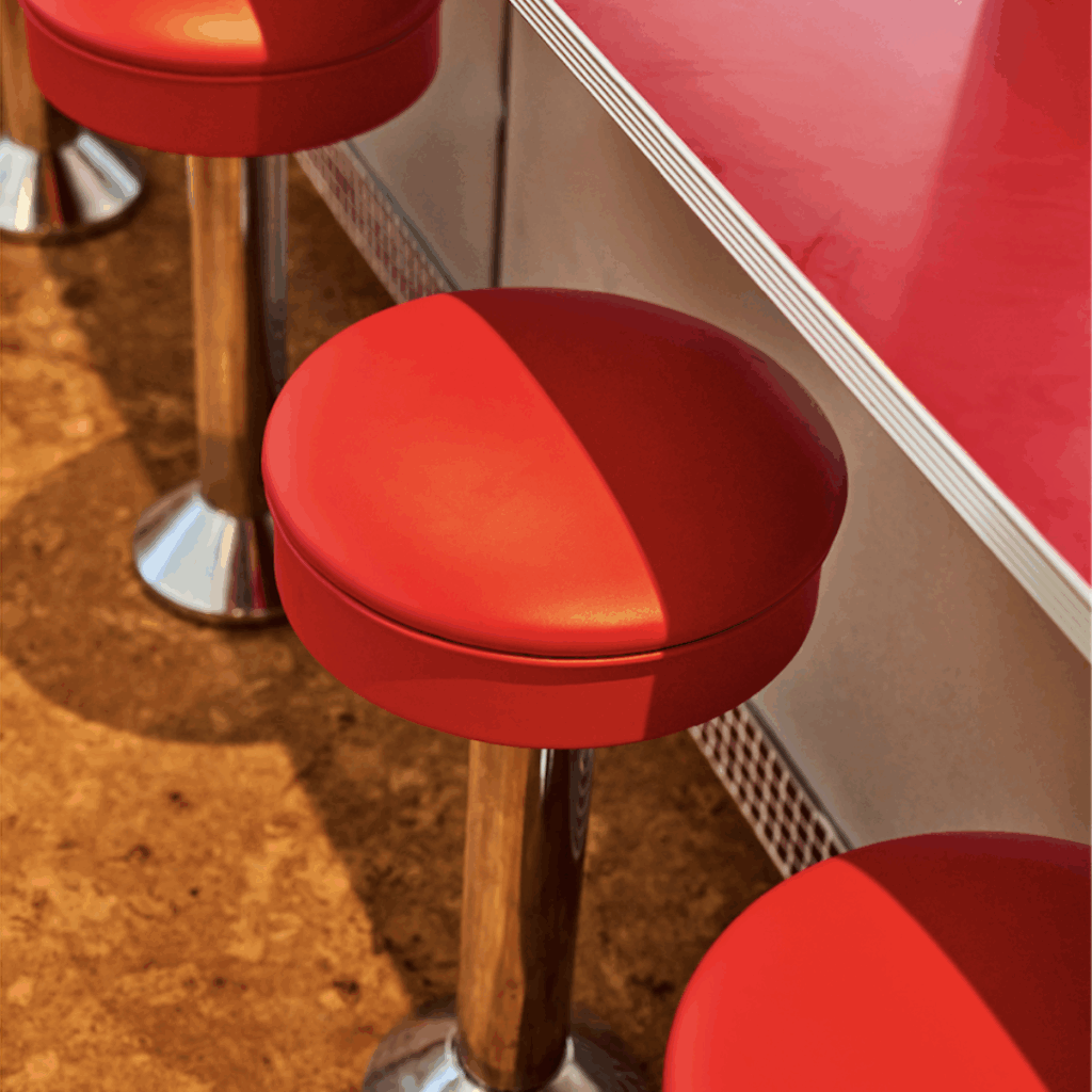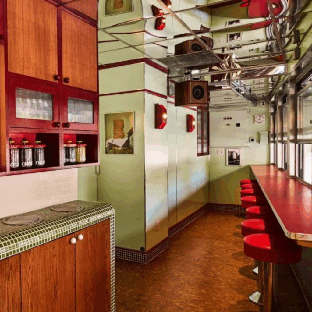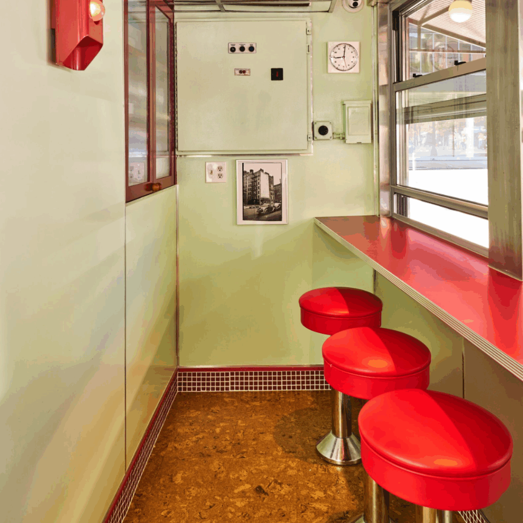 As paredes verde-menta são enfeitadas com laca vermelha brilhante, combinando com balcões de fórmica brilhante e assentos circulares de bancos.