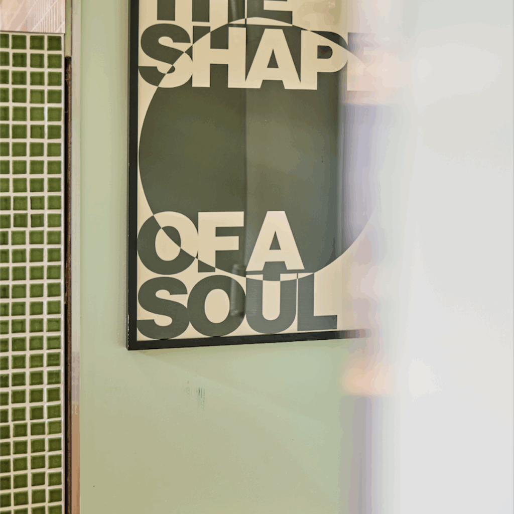 Prateleiras e armários montados na parede cercam uma placa exibindo o menu, acima de uma saliência de mosaicos verdes que incorpora discretamente o descarte de resíduos.