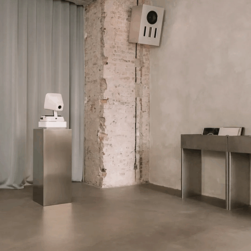 Um pedestal de aço com tecnologia vintage emite um brilho suave, cadeiras se apoiam em formação deliberada contra a parede, ecoando temas de repetição e ritmo.