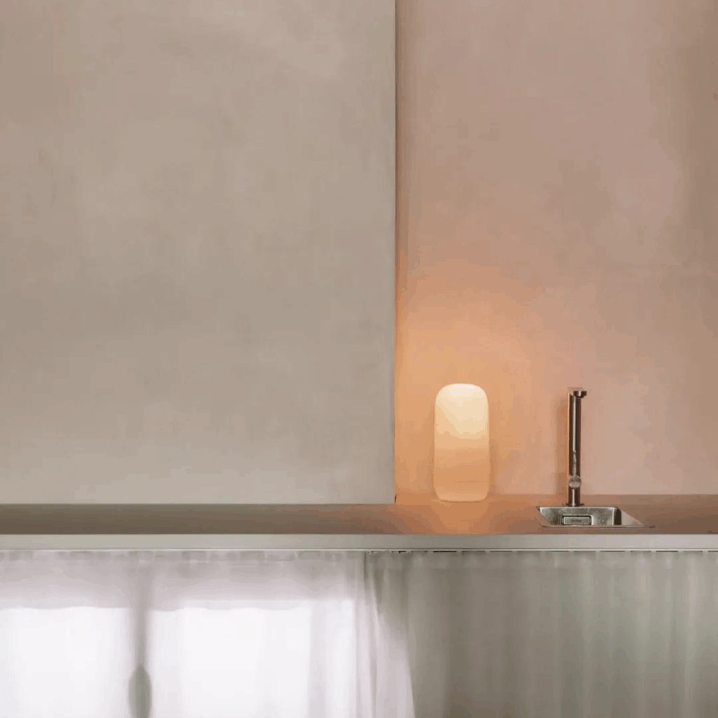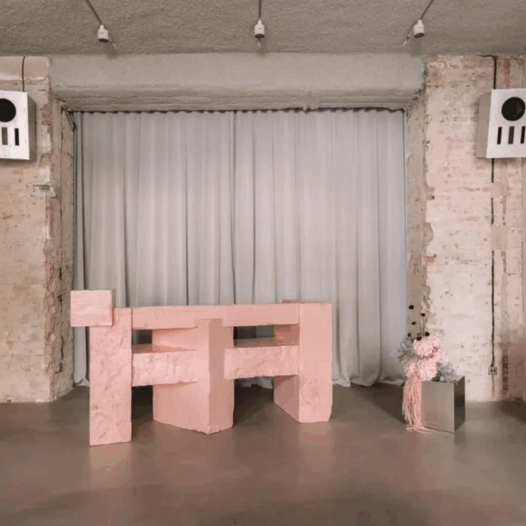 Um contador rosa monolítico, com textura semelhante a espuma, torna-se ao mesmo tempo âncora e anomalia, rompendo a disciplina tonal com uma suavidade inesperada.