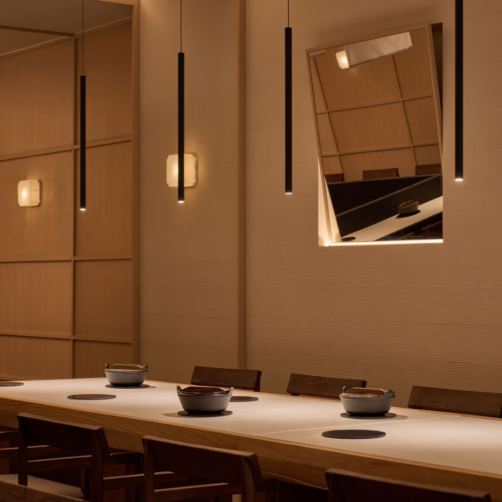 Além das mesas para pequenos grupos, o restaurante oferece mesas comunitárias, assentos no bar para clientes solos, arranjos flexíveis para grupos maiores e salas privativas, criando um ambiente diversificado e socialmente envolvente.