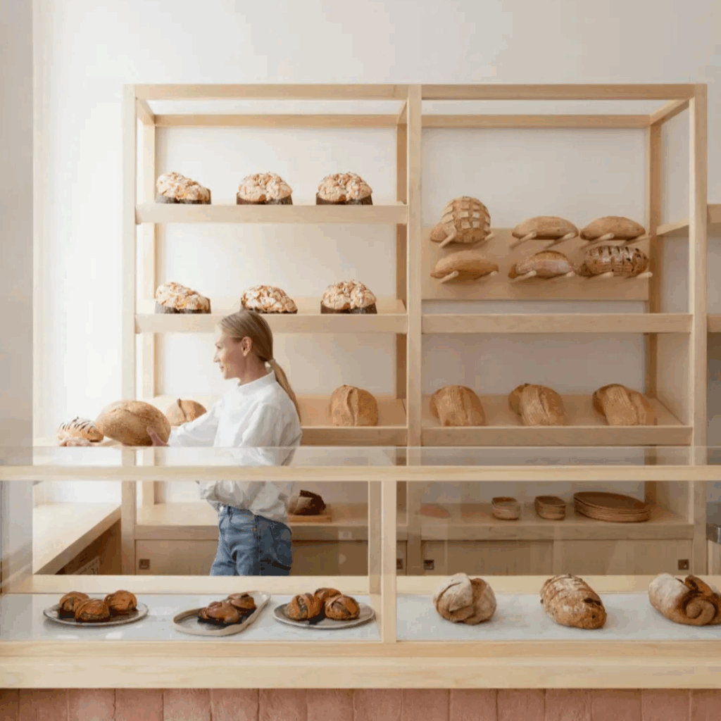 Banquetas curvas e assentos portáteis convidam a uma pausa, enquanto os pães repousam sobre displays flutuantes como esculturas silenciosas.