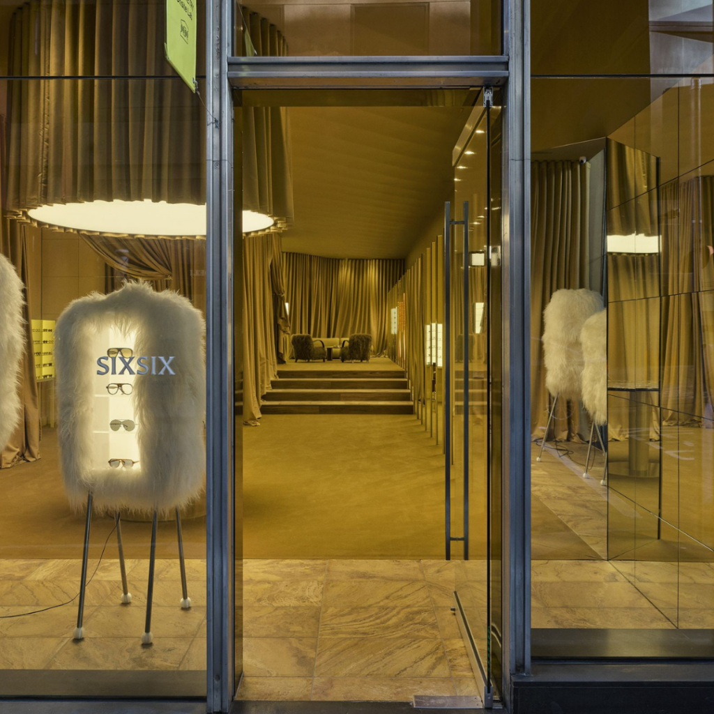 Na Six Six, a maior parte do produto fica voltada para o lado oposto da rua, disposta ao longo de uma parede de exposição em ziguezague que apresenta uma série de espelhos estreitos para a fachada.