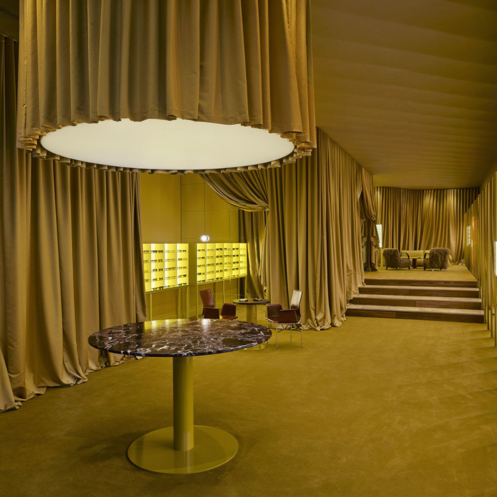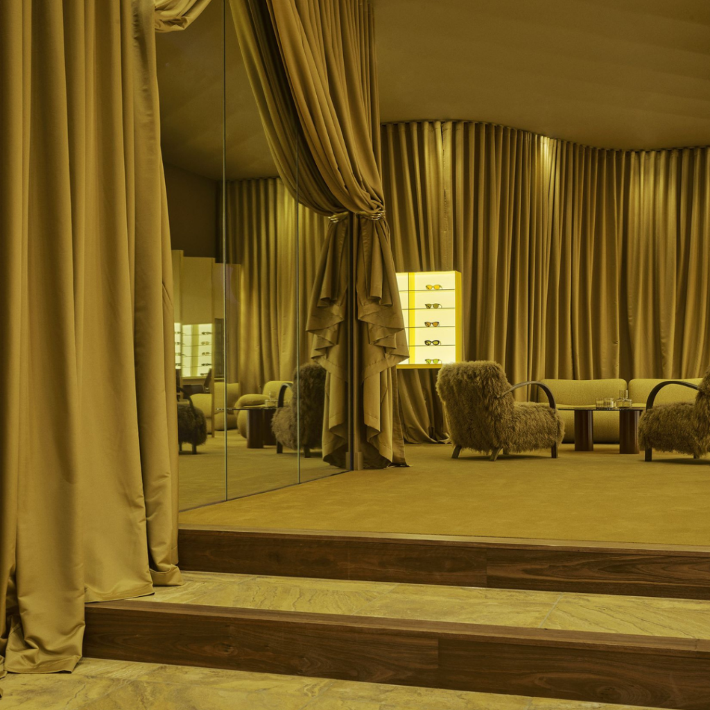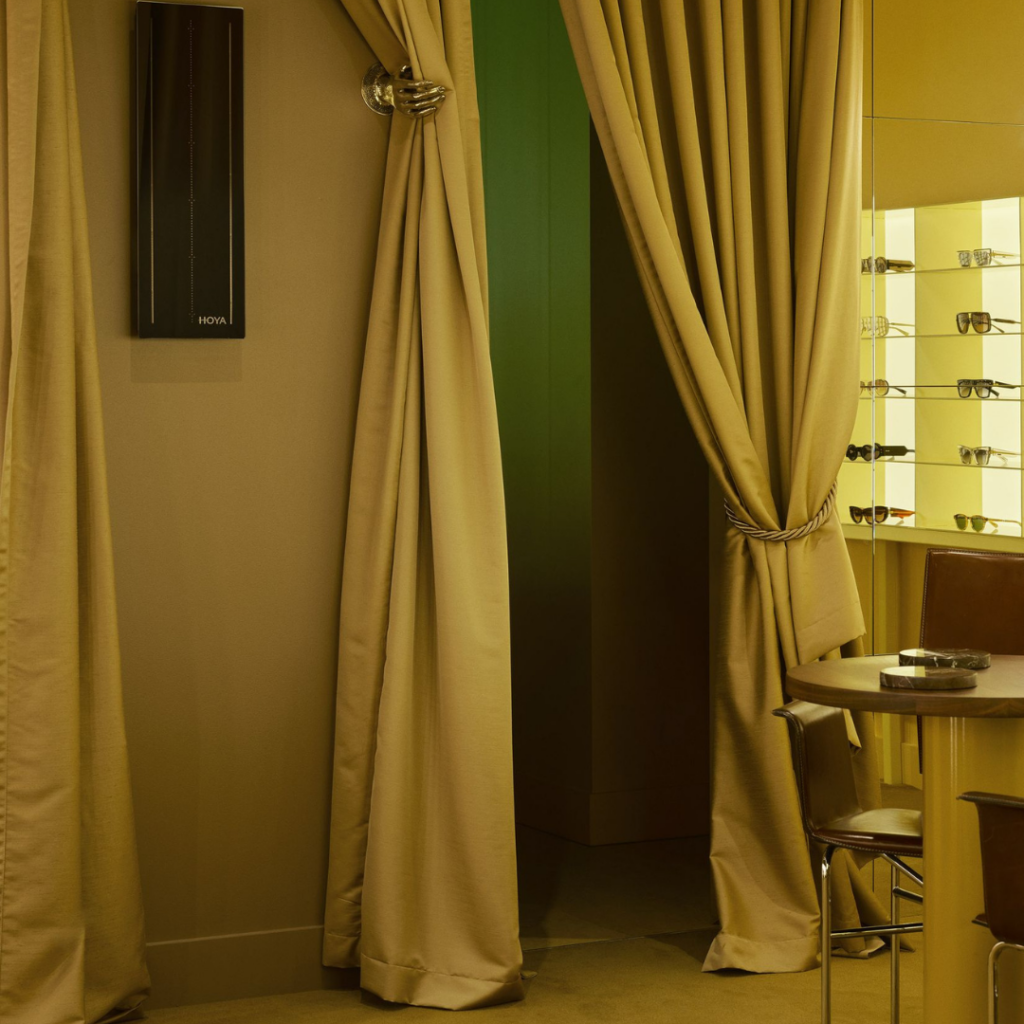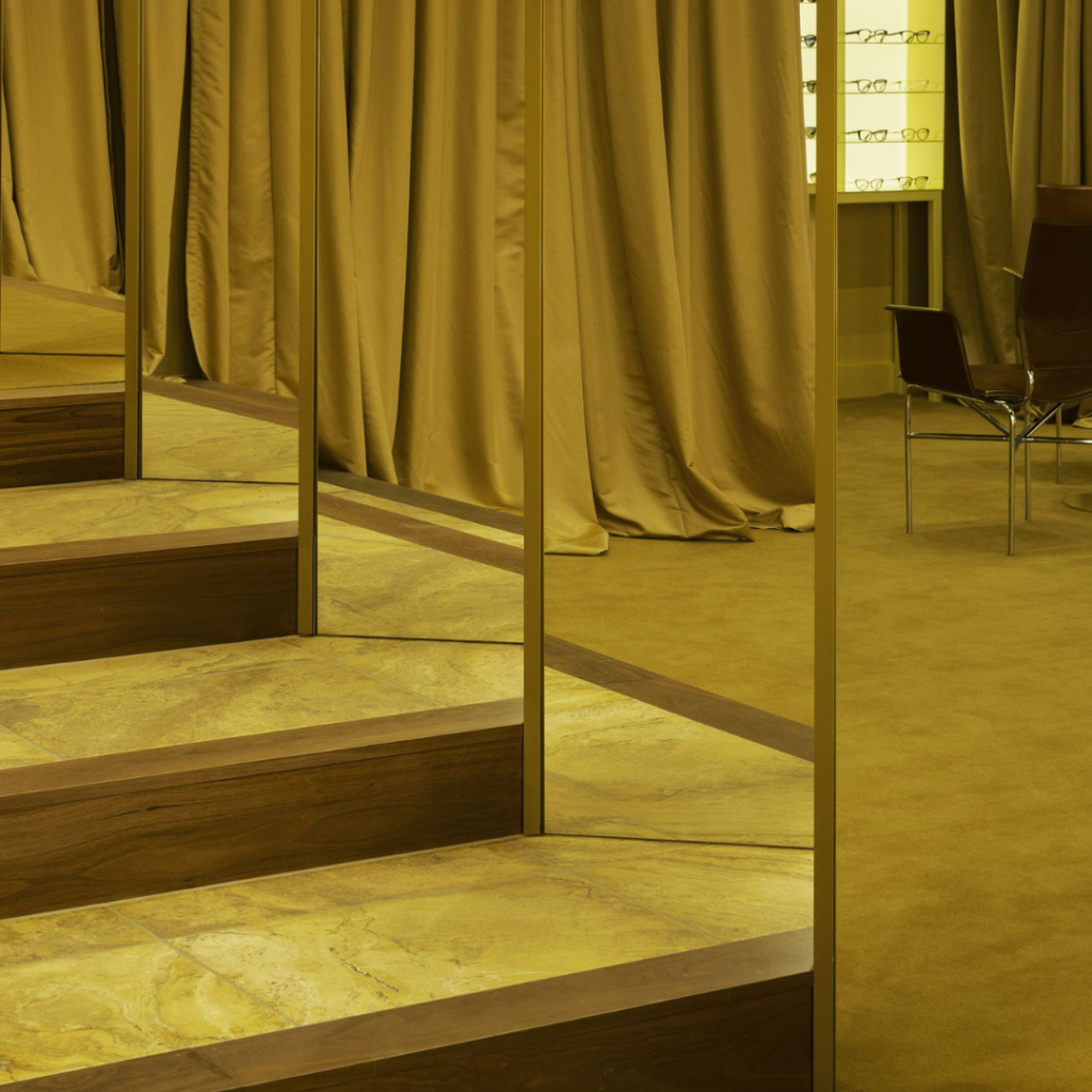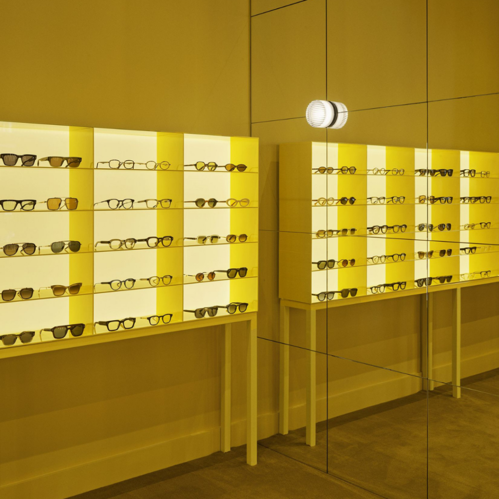 Cada coluna oferece uma exposição discreta e selecionada, com espelhos posicionados imediatamente ao lado do produto, uma decisão ponderada, considerando a intimidade de escolher os óculos.