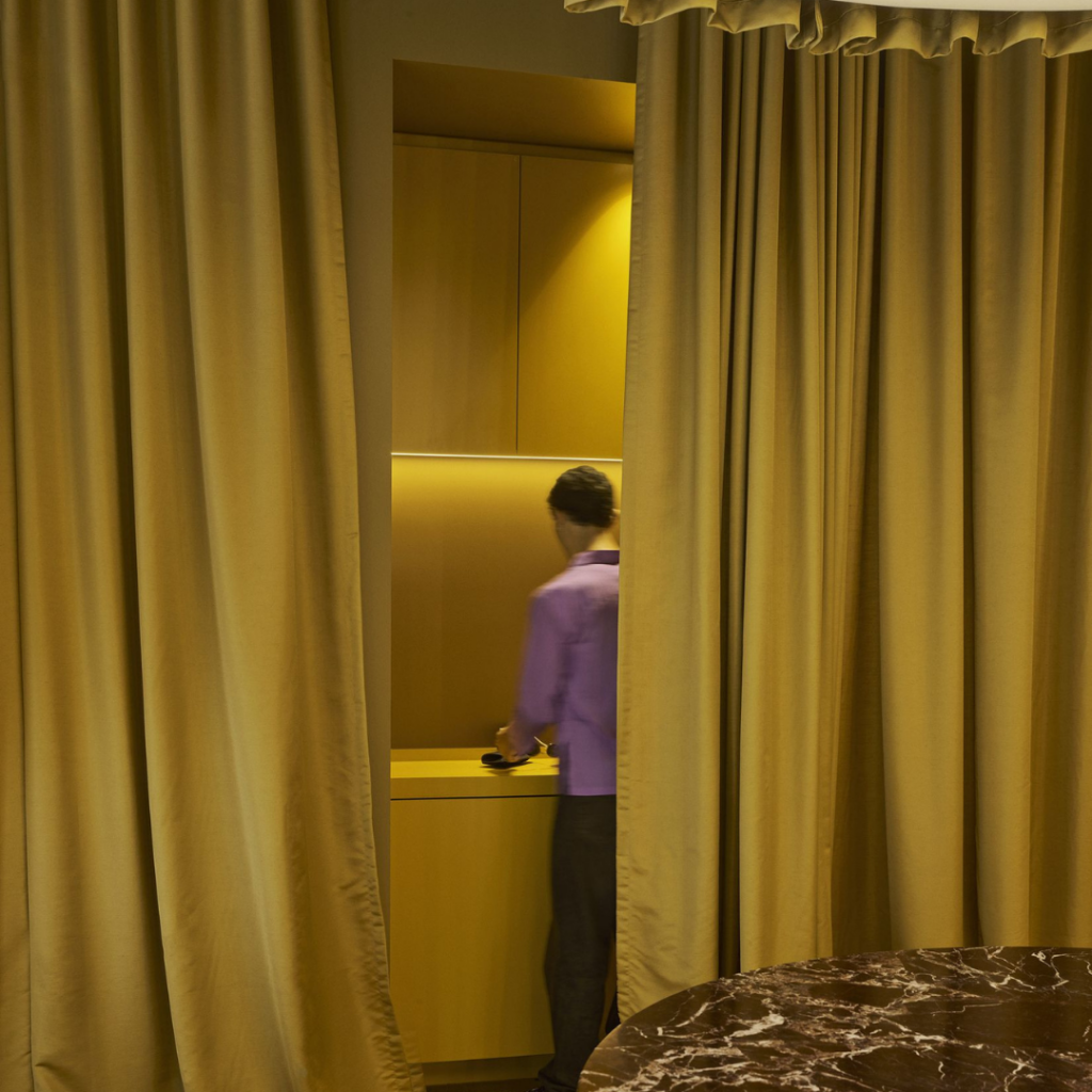 Textura e calor vêm das volumosas cortinas teatrais que revestem as paredes, que também têm função acústica, junto com carpete grosso e marcenaria forrada com Acoufelt, travertino amarelo, jarrah e detalhes de latão que seguram as grandes extensões de tecido.