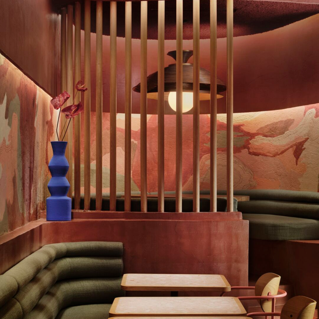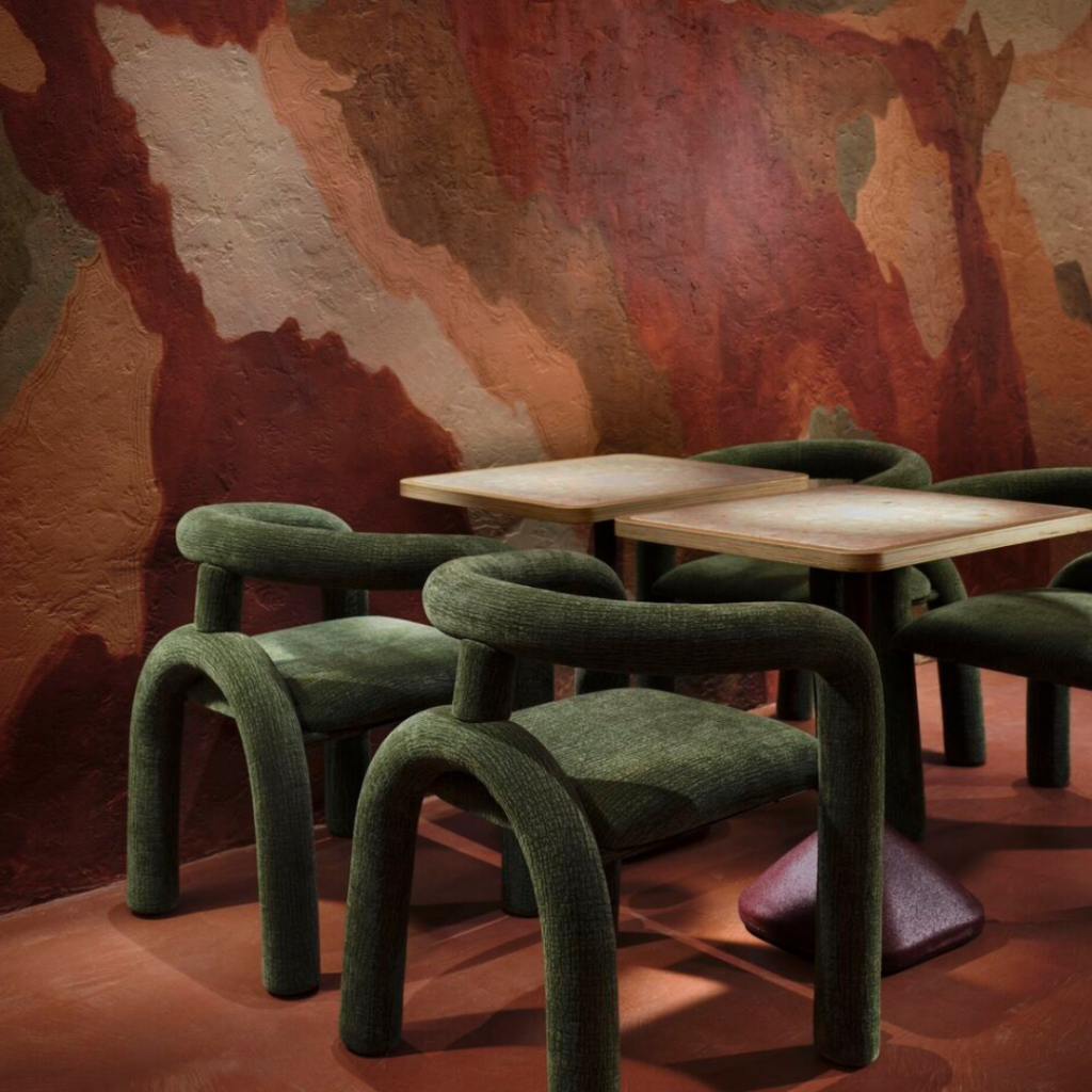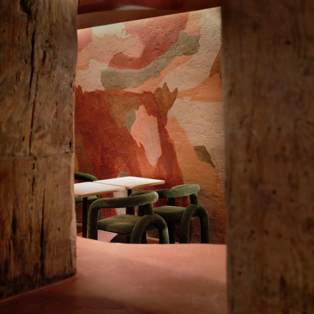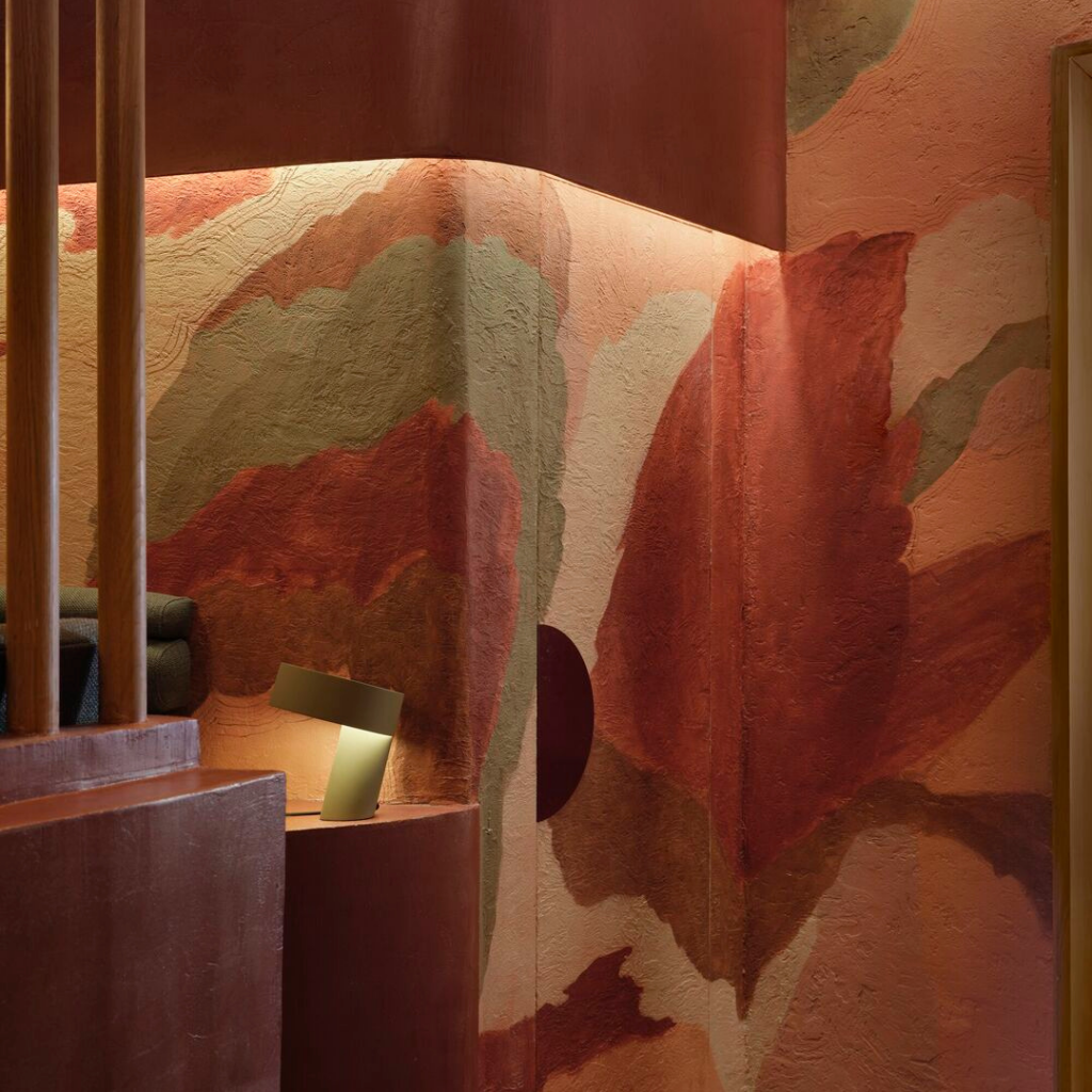 A colaboração com a galeria Santa & Cole possibilitou a intervenção mural da artista Paulina Silva, que trabalha com pigmentos e formas naturais inspiradas em paisagens abstratas e motivos florais, reforçando a coesão visual do espaço.
