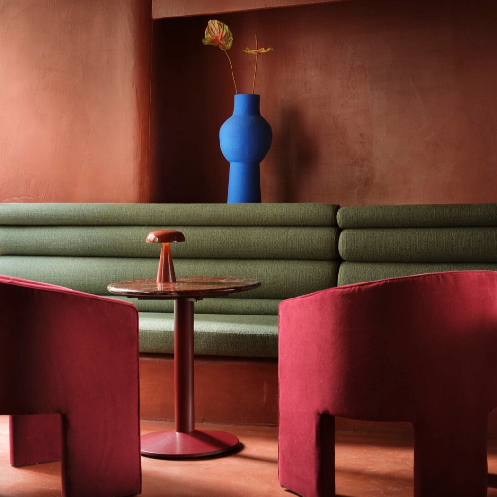 Pequenos vasos cerâmicos azuis de Klein de Marrakech são distribuídos como âncoras visuais, estabelecendo um diálogo direto com o conceito gastronômico, onde cada prato celebra a terra e sua diversidade cromática.