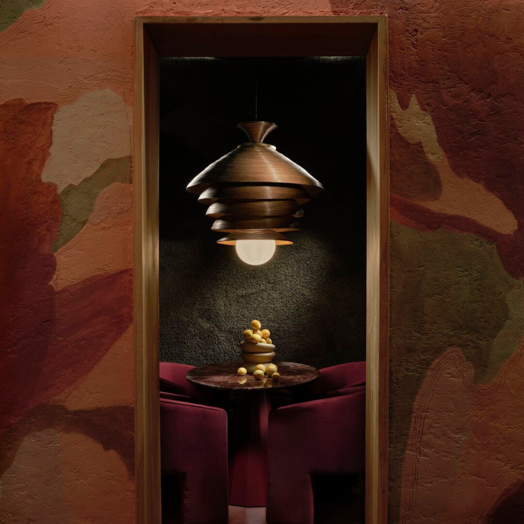 O mural ganha uma presença dramática, enquanto luminárias personalizadas criam pontos íntimos de luz que definem uma atmosfera acolhedora e acolhedora.