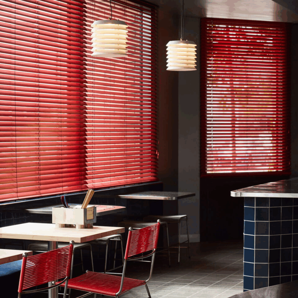 Acentos vermelhos ousados são integrados em todo o espaço, principalmente nas persianas, que filtram suavemente a luz ao longo do dia.