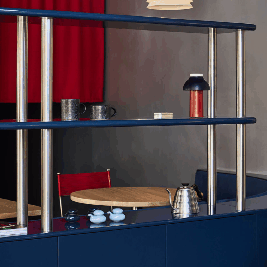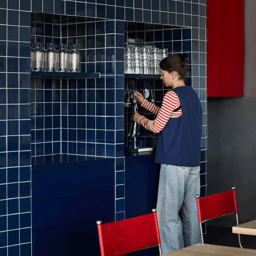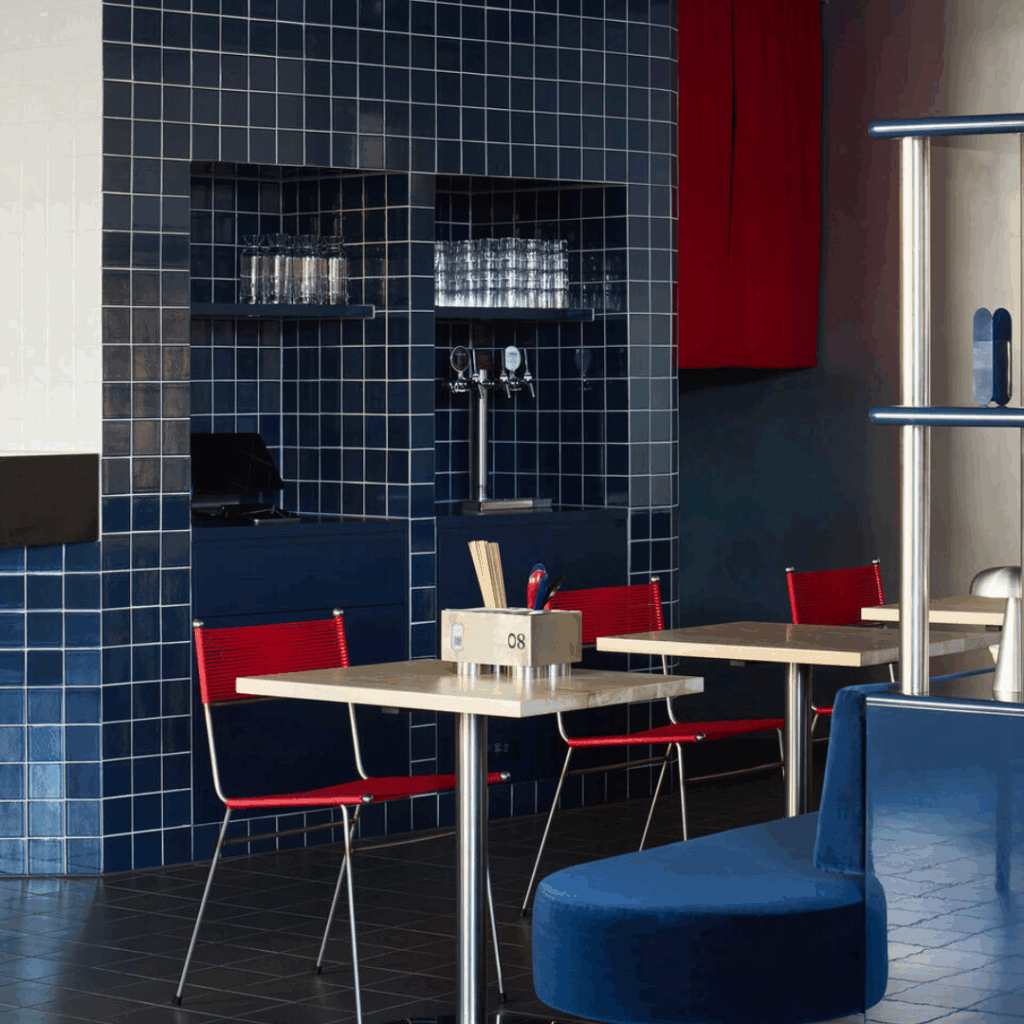 Mais fundo no espaço, azuis ricos ancoram a área de hospitalidade, oferecendo um calor reconfortante que contrasta com a energia movimentada da loja.