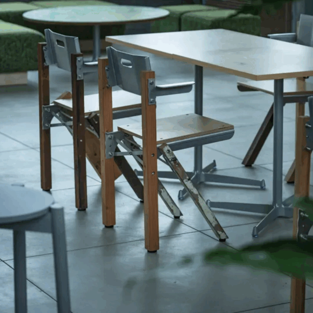 Abaixo deles estão cadeiras co-projetadas pelo artista holandês Sander Wassink em colaboração com ilhéus, objetos que incorporam um contrato social entre designer, comunidade e lugar.