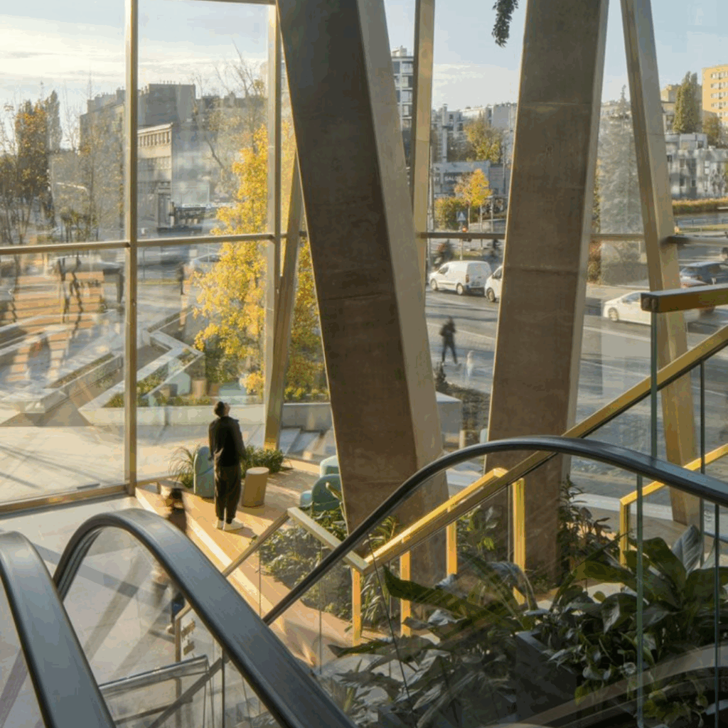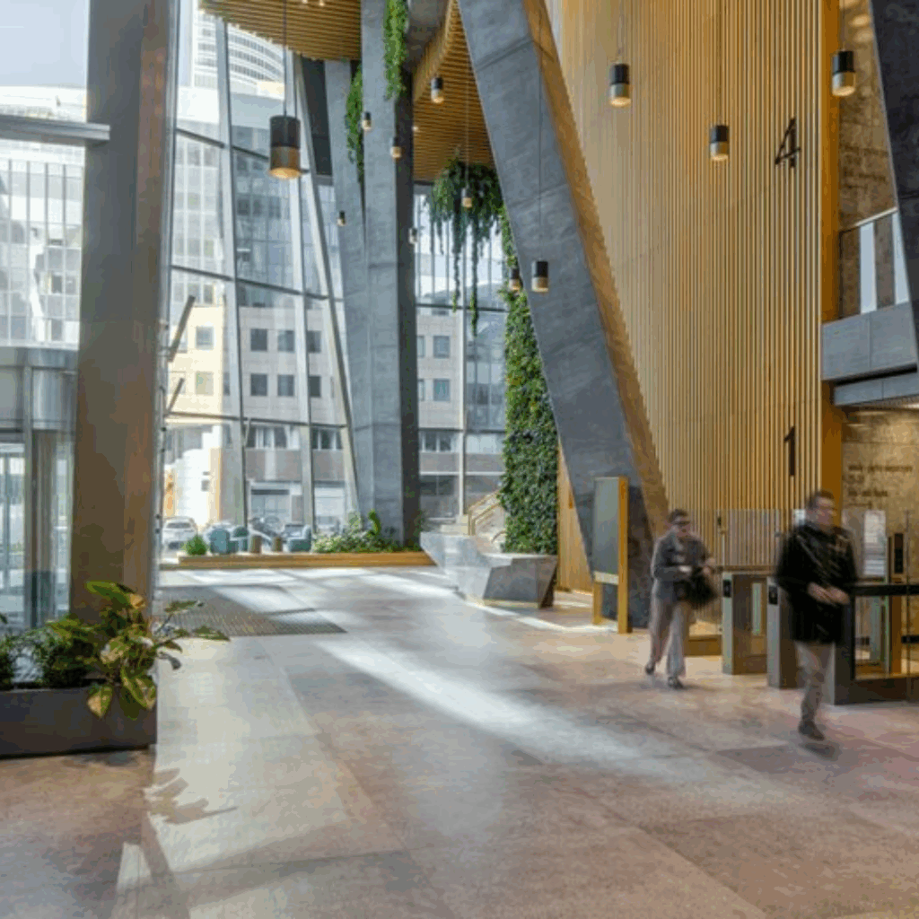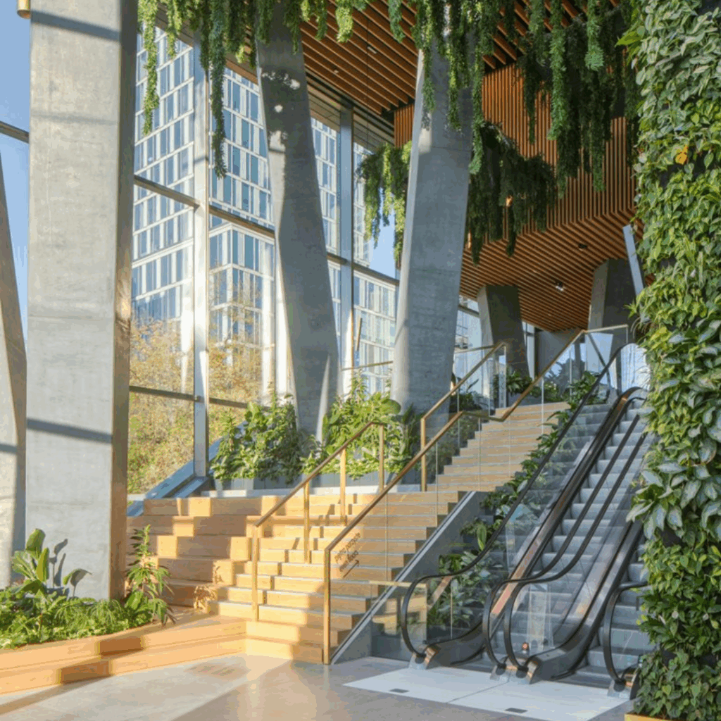 O design do saguão conectivo equilibra elementos industriais, como colunas de concreto em tom de grafite, com calor e vegetação, incorporando painéis de madeira, instalações de plantas e paredes verdes.