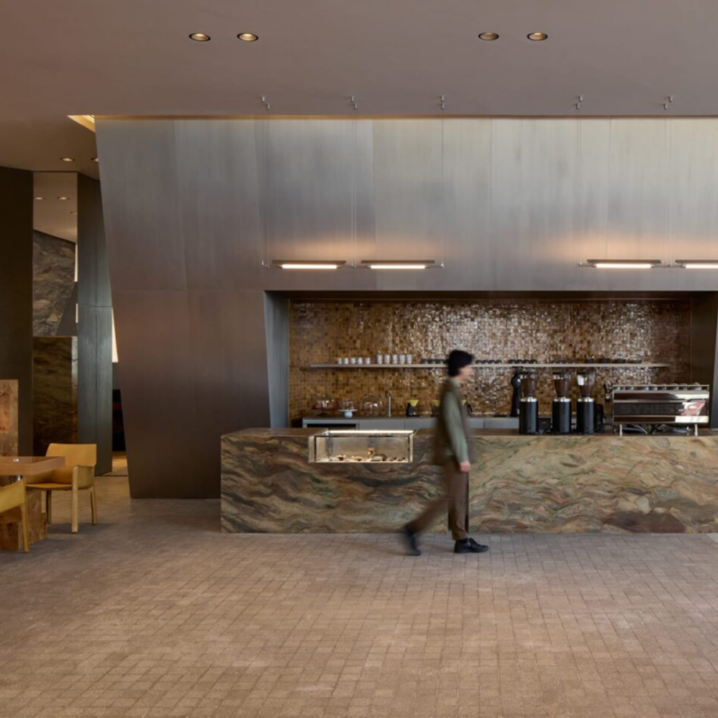 Ao entrar no restaurante, os clientes são convidados a relaxar no eclético bar lounge que é ancorado por uma dramática “onda quebrando” construída de enormes vigas de madeira laminada colada, suspensas como se congeladas no tempo sobre o bar de drinks revestido de aço corten e pedra.