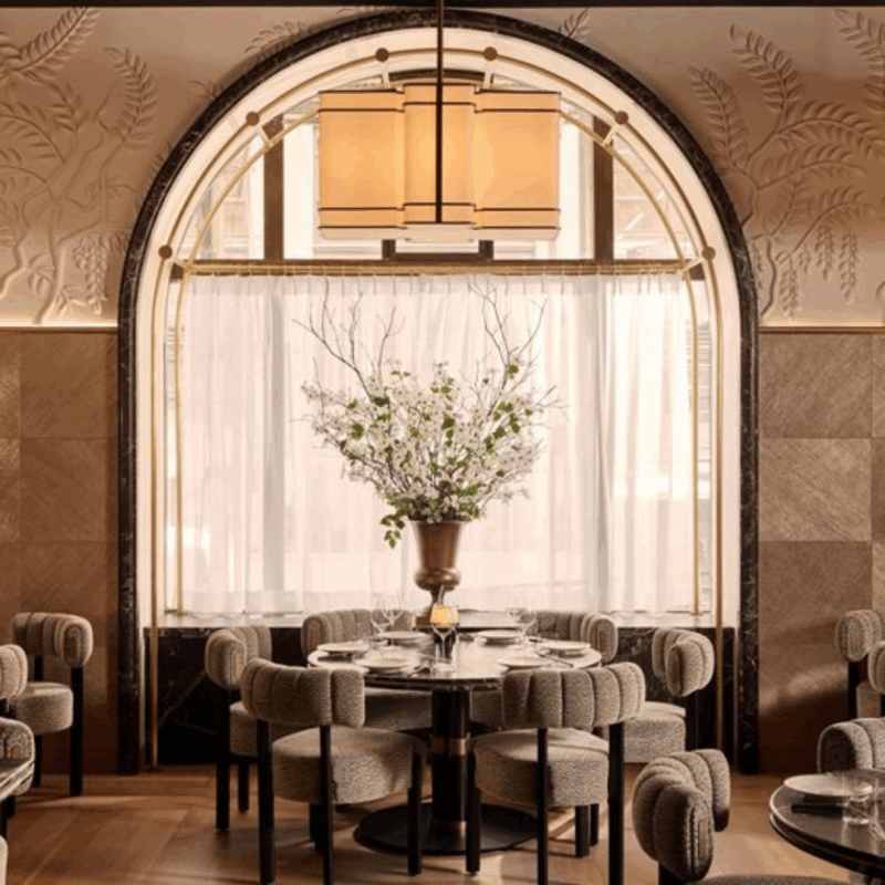 Há um espaço central alinhado com assentos altos e centrado em torno de duas mesas grandes para seis pessoas, e uma área menor e privada com mesas mais baixas para um jantar mais íntimo.