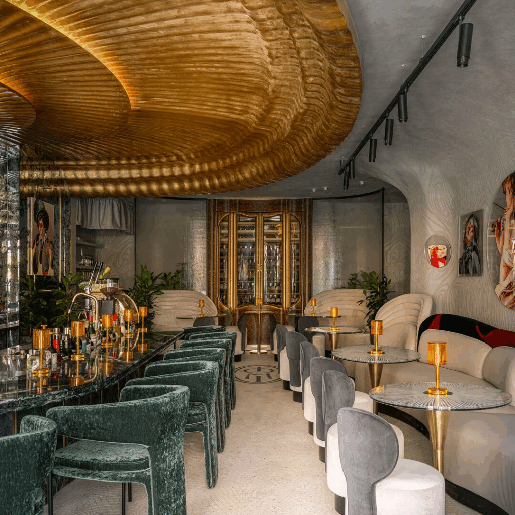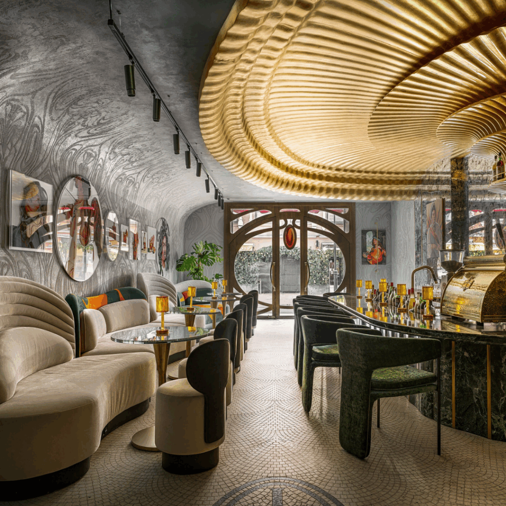 Da rua, uma fachada inspirada na Art Nouveau dá o tom, atraindo os visitantes para um interior onde textura, material e narrativa se entrelaçam.