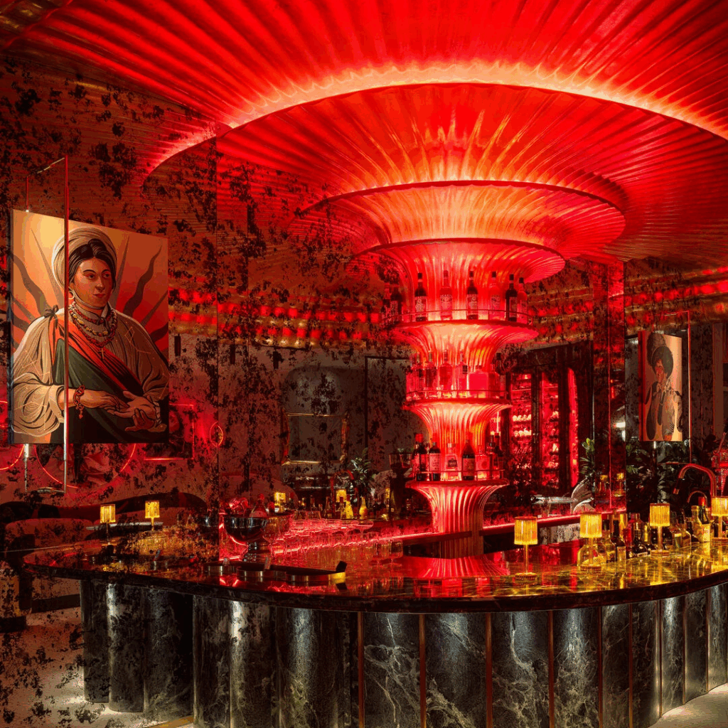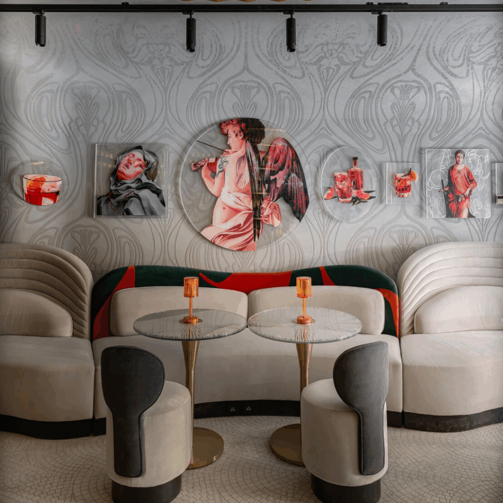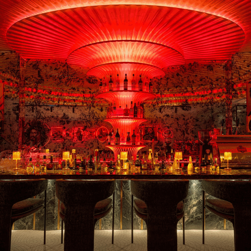 À medida que a noite cai, ela se transforma: cores saturadas, iluminação dramática e reflexos espelhados definem o cenário para um autêntico bar Negroni, transportando os clientes para a vibrante vida noturna de Milão.