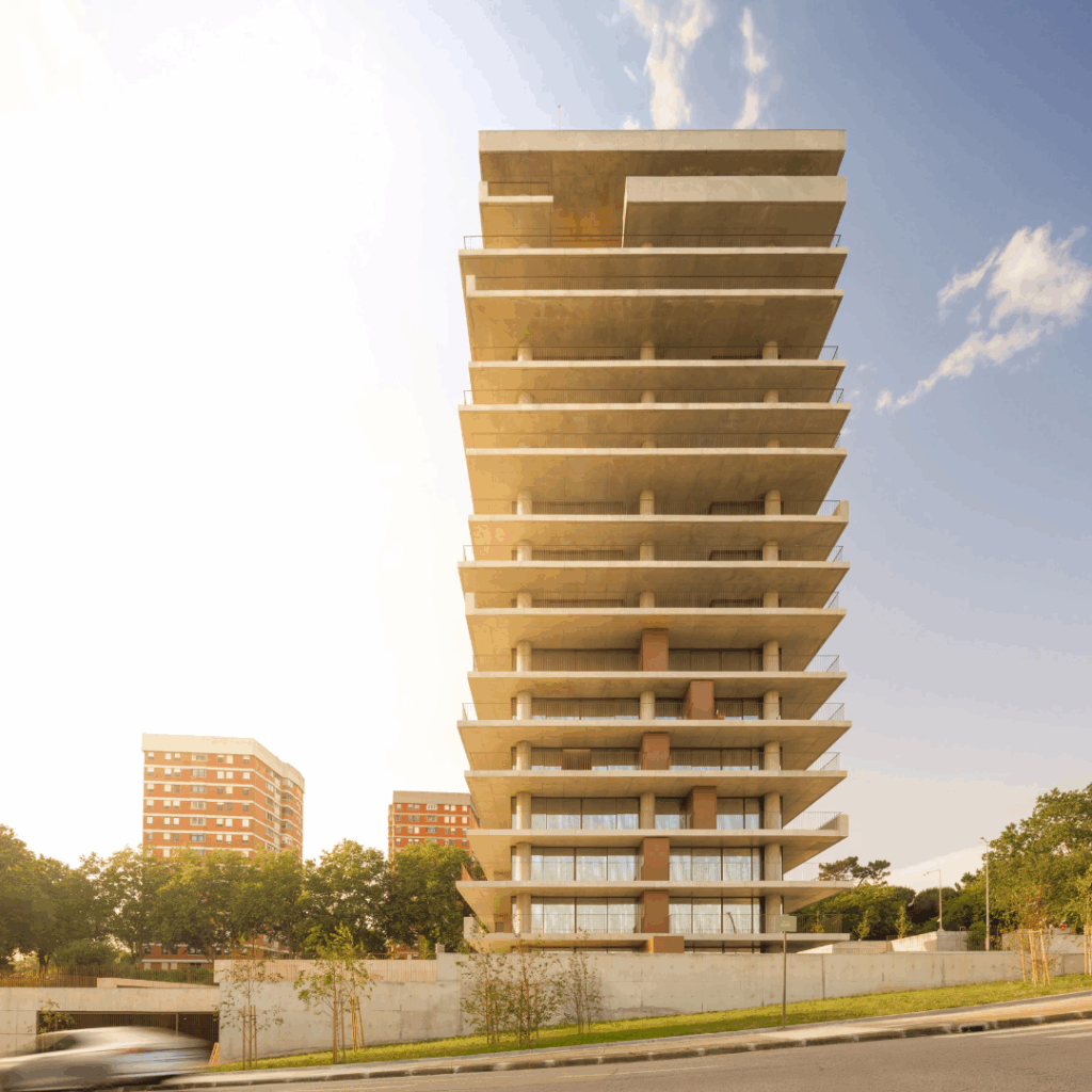 A composição volumétrica é o resultado do impulso arquitetônico e da ambição de desenvolver tipologias habitacionais com mais de 200 metros quadrados de áreas de varanda por piso.