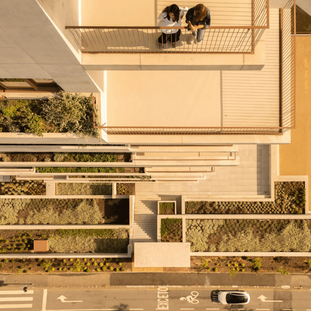 No térreo, um átrio associado a outros usos possui vegetação natural que proporciona um microclima de biodiversidade ligado ao entorno natural.