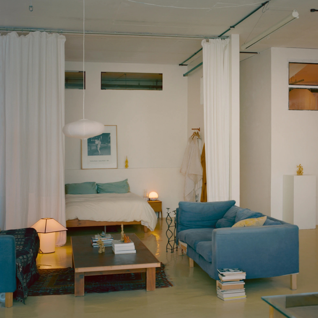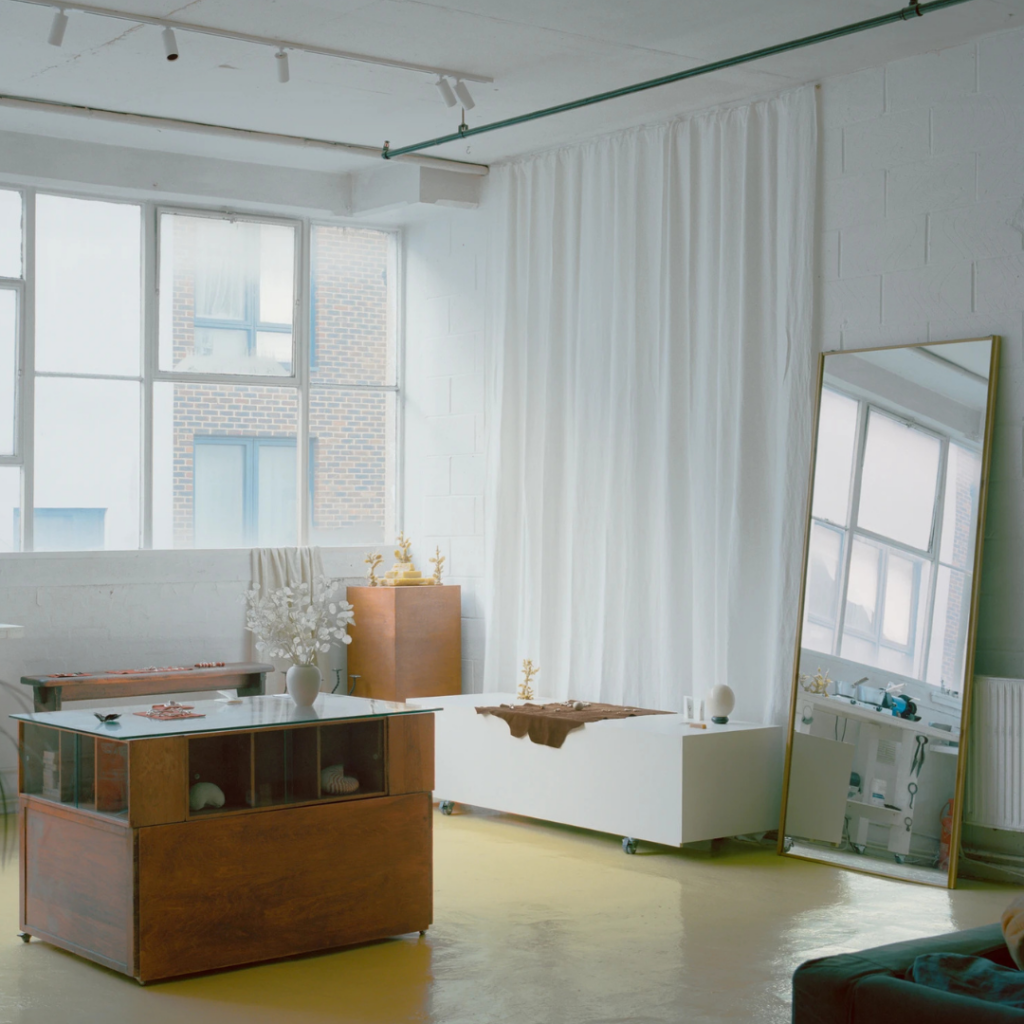 O interior reflete essa ambição: superfícies quentes, objetos coletados, plantas escalando por volumes industriais e as ferramentas de sua prática de joalheria nunca distantes da vista.